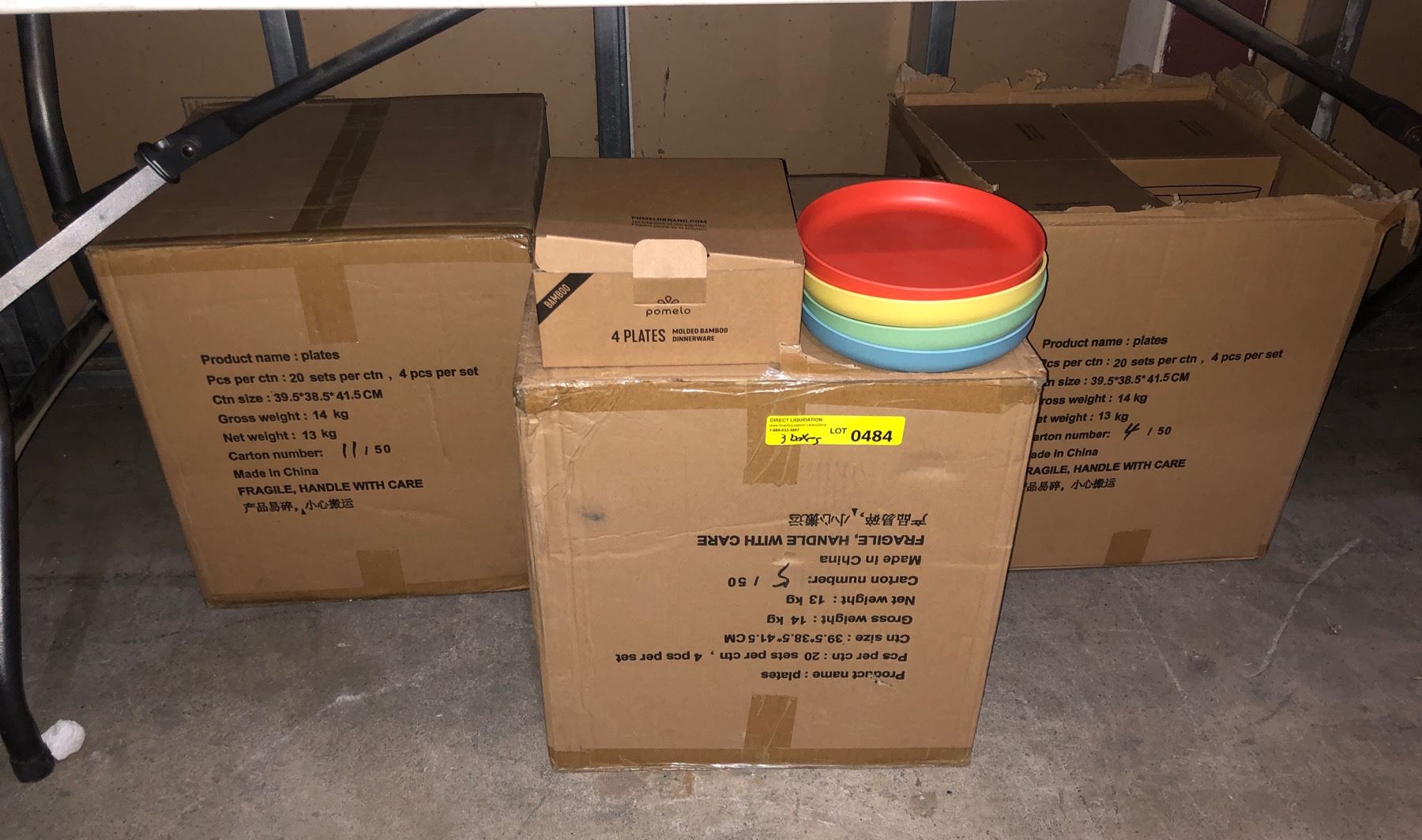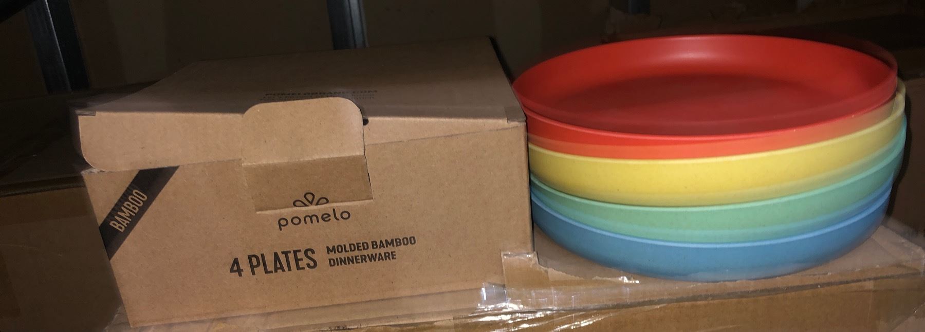 NEW - POMELO Group of 3 boxes full of multi-colors bamboo plates - NEW IN BOX (4p. per set)