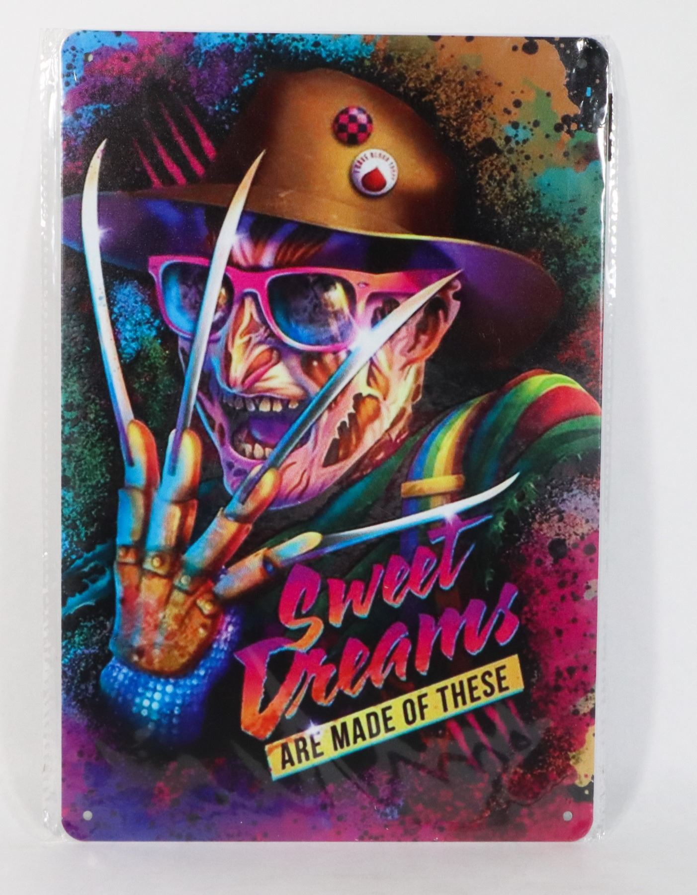 FREDDY KRUEGER SWEET DREAMS ARE MADE OF THESE METAL WALL SIGN. APPROX. 12"X8". PREDRILLED HOLES FOR HANGING