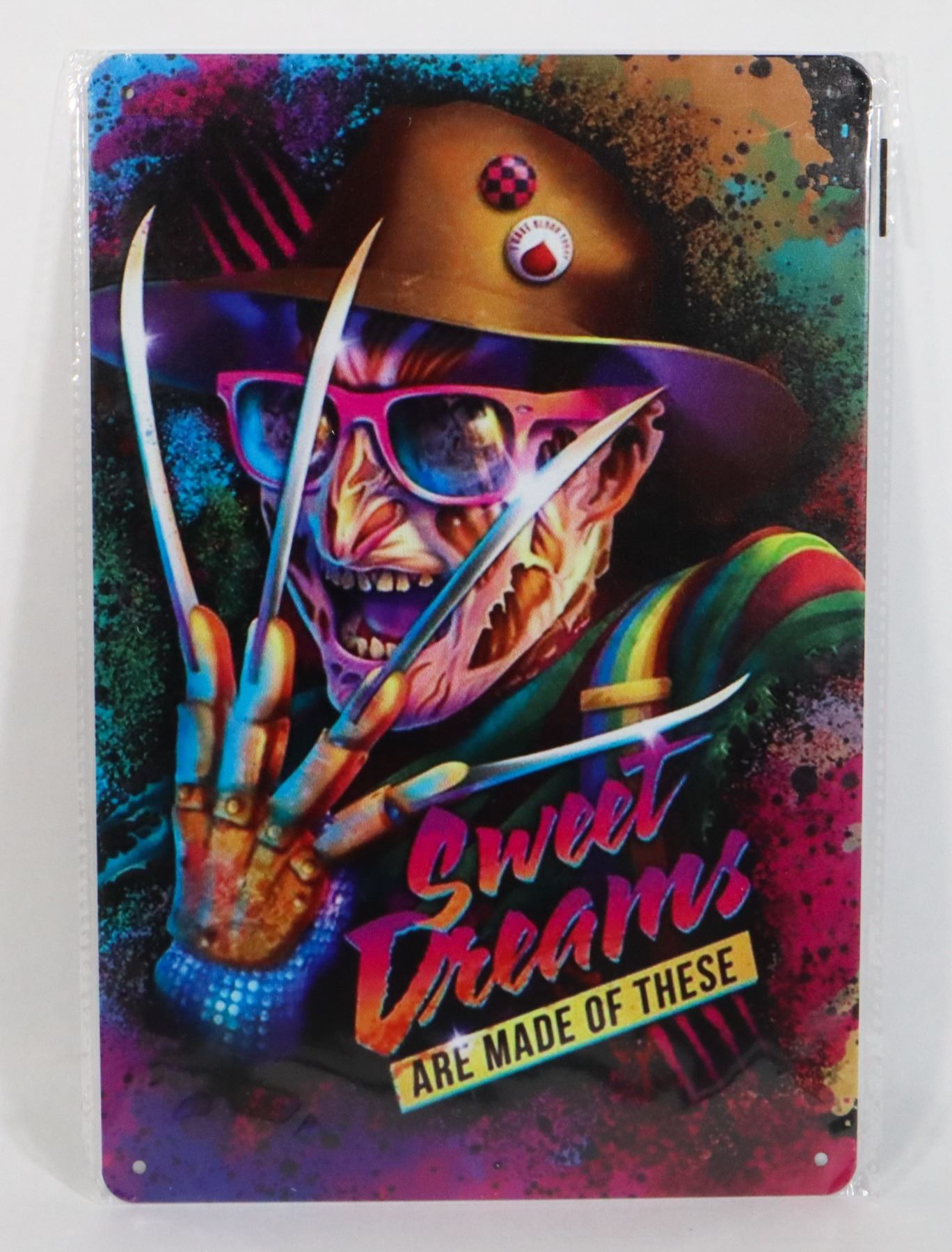 FREDDY KRUEGER SWEET DREAMS ARE MADE OF THESE METAL WALL SIGN. APPROX. 12"X8". PREDRILLED HOLES FOR HANGING