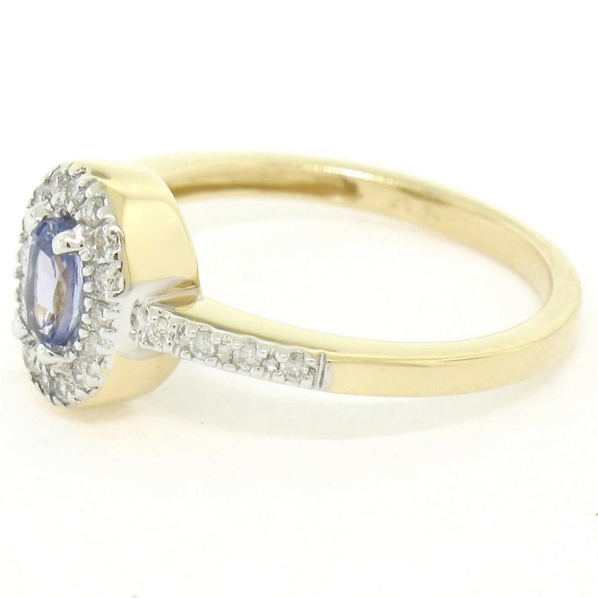 One NEW Petite 14K Yellow Gold 0.50 ctw Oval Cut Tanzanite Ring w/ Round Diamond Halo. Item Details: Material: 14K Solid Yellow Gold, Weight: 2.35 Grams, Stone(s): (1) Natural Genuine Tanzanite - Oval Cut - Prong Set - Rich Lavender Color - 0.25ct (approx.), (24) Natural Genuine Diamonds - Round Brilliant Cut - Pavé Set - VS2 Clarity - G/H Color - 0.25ctw (approx.), Total Carat Weight: 0.50 (approx.), Ring Size: 5.5 , Ring Width: 9.38mm, Ring Height: 4.66mm rise off the finger Condition: New w/o Tag