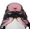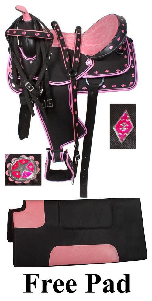 Saddle Specs Color Black and Pink Soft Padded Seat Pink Conchos Blevin Buckles Silver Concho Adjustable Padded Stirrups Soft fleece underside eliminates pressure points Strong tree double reinforced fiberglass tree Saddle Measurements Gullet 6.5" QH Bars, 7.25" High. Can accomodate high withered horses Cantle 5" Swell 12" Skirt Length 24" Stirrups 26" Shortest 33" Longest More room is available for adjustments.