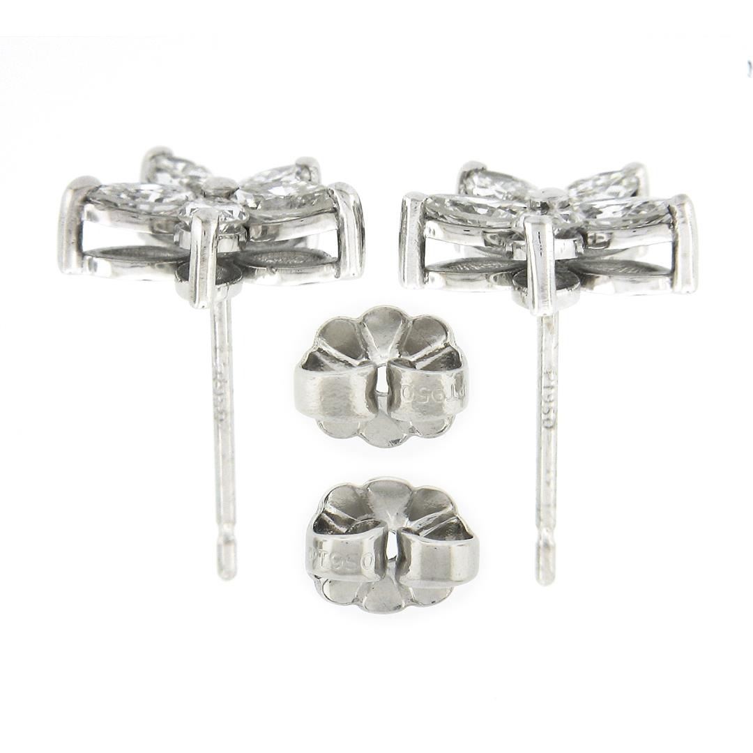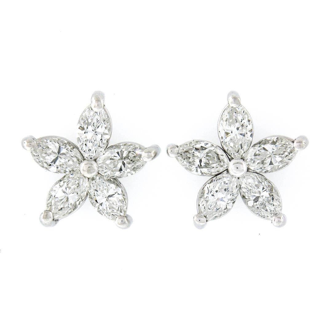 A new solid platinum flower stud earrings, with 10 marquise cut natural diamonds (H/I - VS1/VS2 ; 1.04ctw). The earrings measure approximately 10.80mm point to point, and weigh a total of 2.93 grams.
