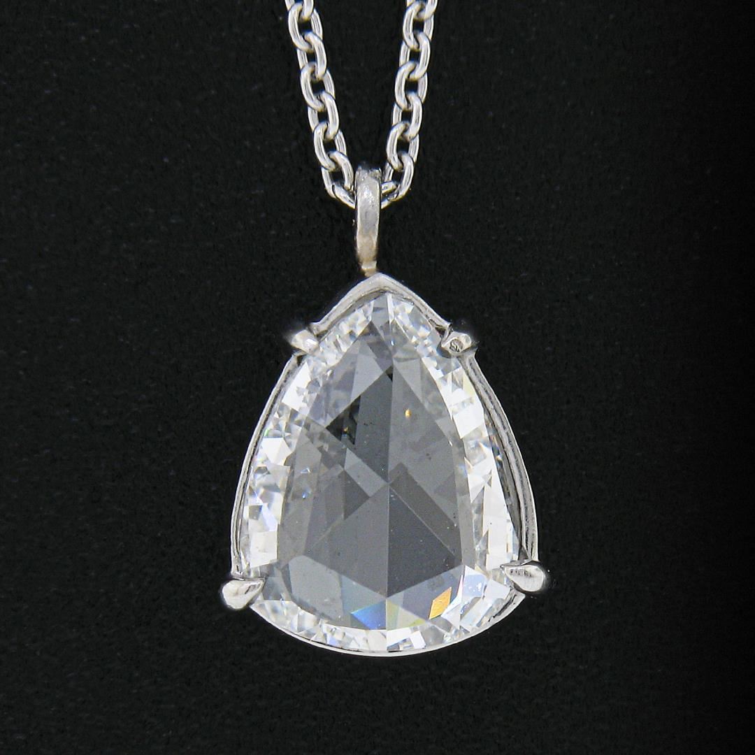 A new solid platinum solitaire pendant necklace, with 1 GIA graded pear rose cut natural diamond (E - VS1 ; 1.38ct). 18 inch cable link chain, 4.62 grams total weight, pendant measures 13.1x9mm. Comes with all original relevant certifications.
