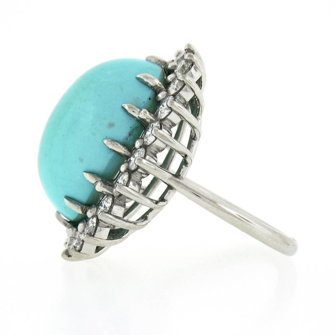 A new solid platinum cocktail ring, featuring 1 oval cabochon cut natural turquoise (20.3x14.5mm), surrounded with a halo of 20 round brilliant cut natural diamonds (G/H - VS1/VS2 - 2.06ctw). The ring is size 6.5, weighs a total of 18.91 grams, and measures 28.4mm wide.
