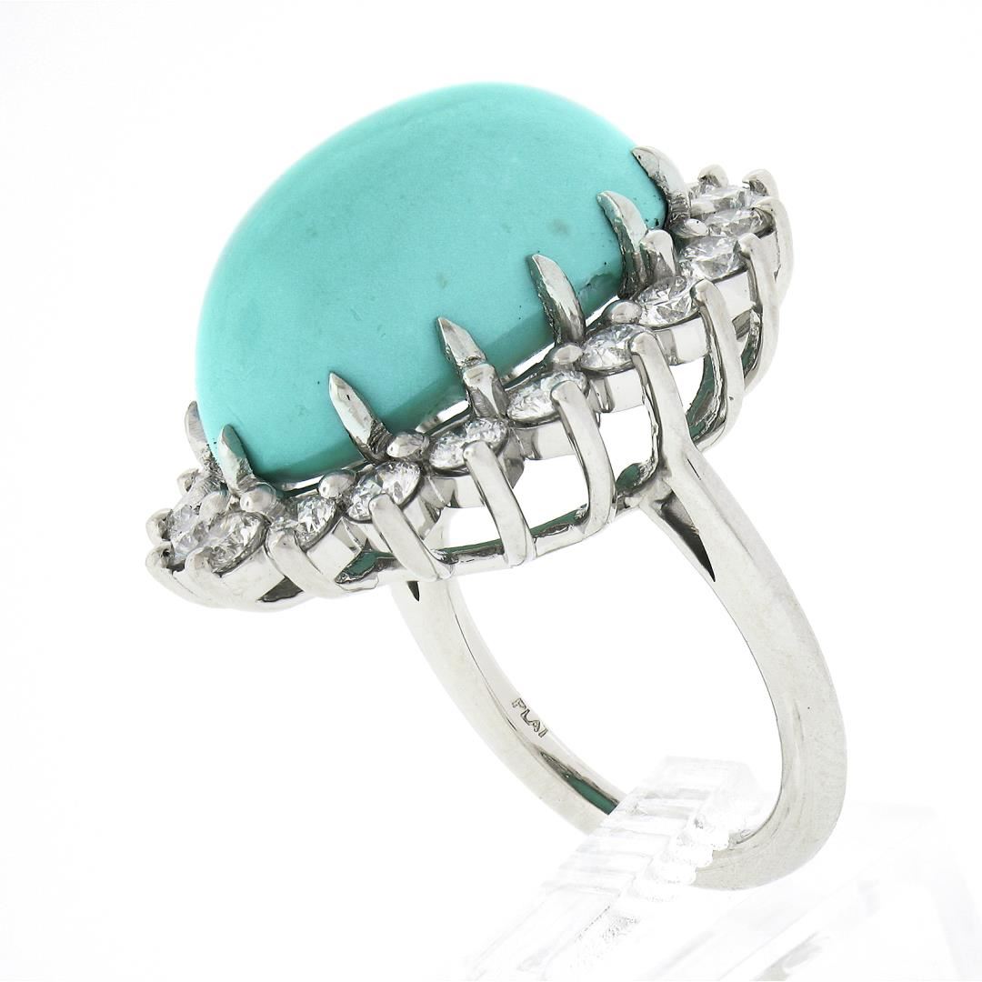 A new solid platinum cocktail ring, featuring 1 oval cabochon cut natural turquoise (20.3x14.5mm), surrounded with a halo of 20 round brilliant cut natural diamonds (G/H - VS1/VS2 - 2.06ctw). The ring is size 6.5, weighs a total of 18.91 grams, and measures 28.4mm wide.