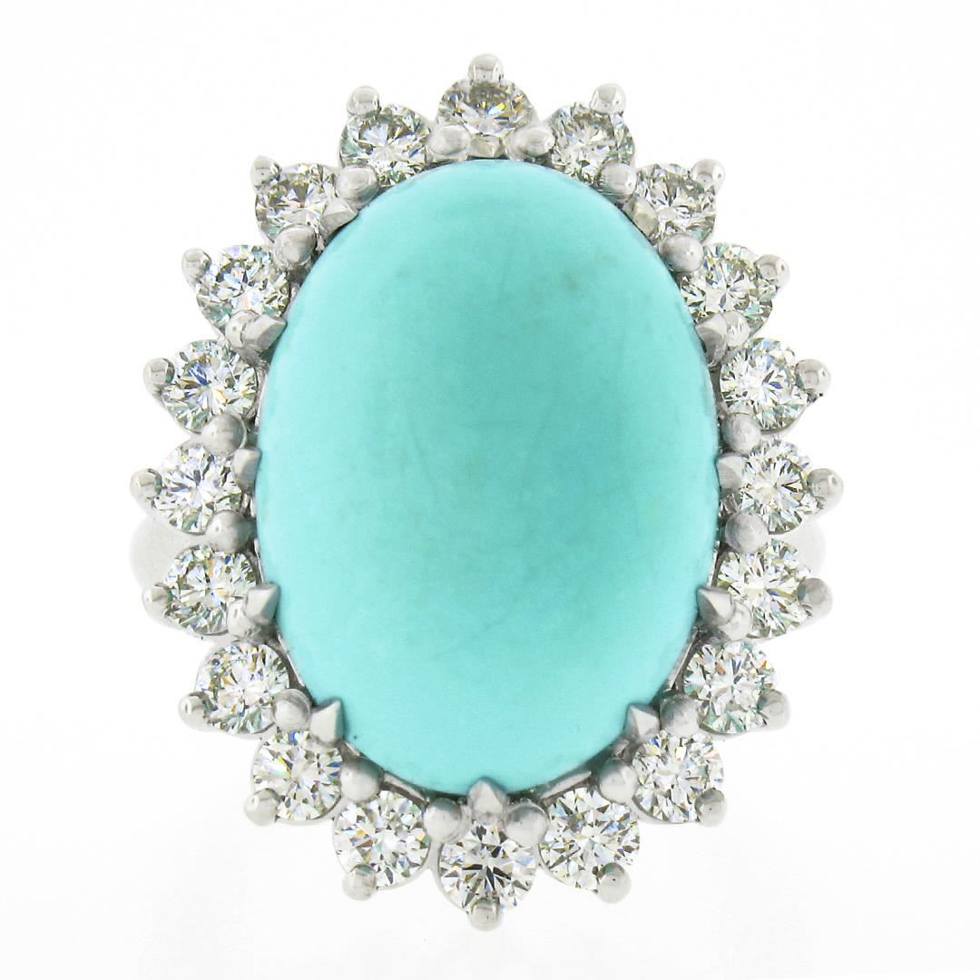 A new solid platinum cocktail ring, featuring 1 oval cabochon cut natural turquoise (20.3x14.5mm), surrounded with a halo of 20 round brilliant cut natural diamonds (G/H - VS1/VS2 - 2.06ctw). The ring is size 6.5, weighs a total of 18.91 grams, and measures 28.4mm wide.