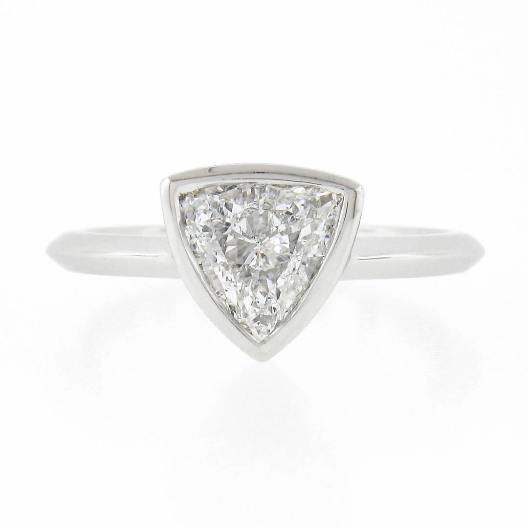 A new solid platinum solitaire ring, with 1 GIA graded trillion cut natural diamond (G - SI2 ; 1.01ct). The ring is size 6.0, weighs a total of 5.0 grams, and measures 8.90mm wide. Comes with all original relevant certifications.