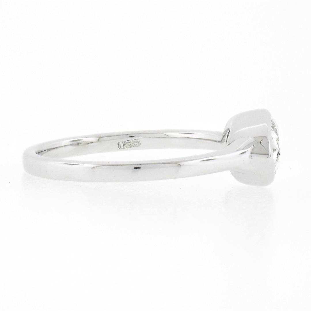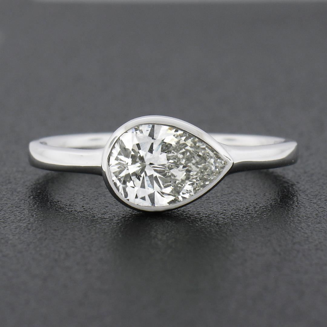 A new platinum sideways solitaire ring, with 1 GIA graded pear cut natural diamond (J - SI2 ; 1.06ct). The ring is size 6.5, weighs a total of 3.87 grams, and measures 6.75mm wide. Comes with all original relevant certifications.