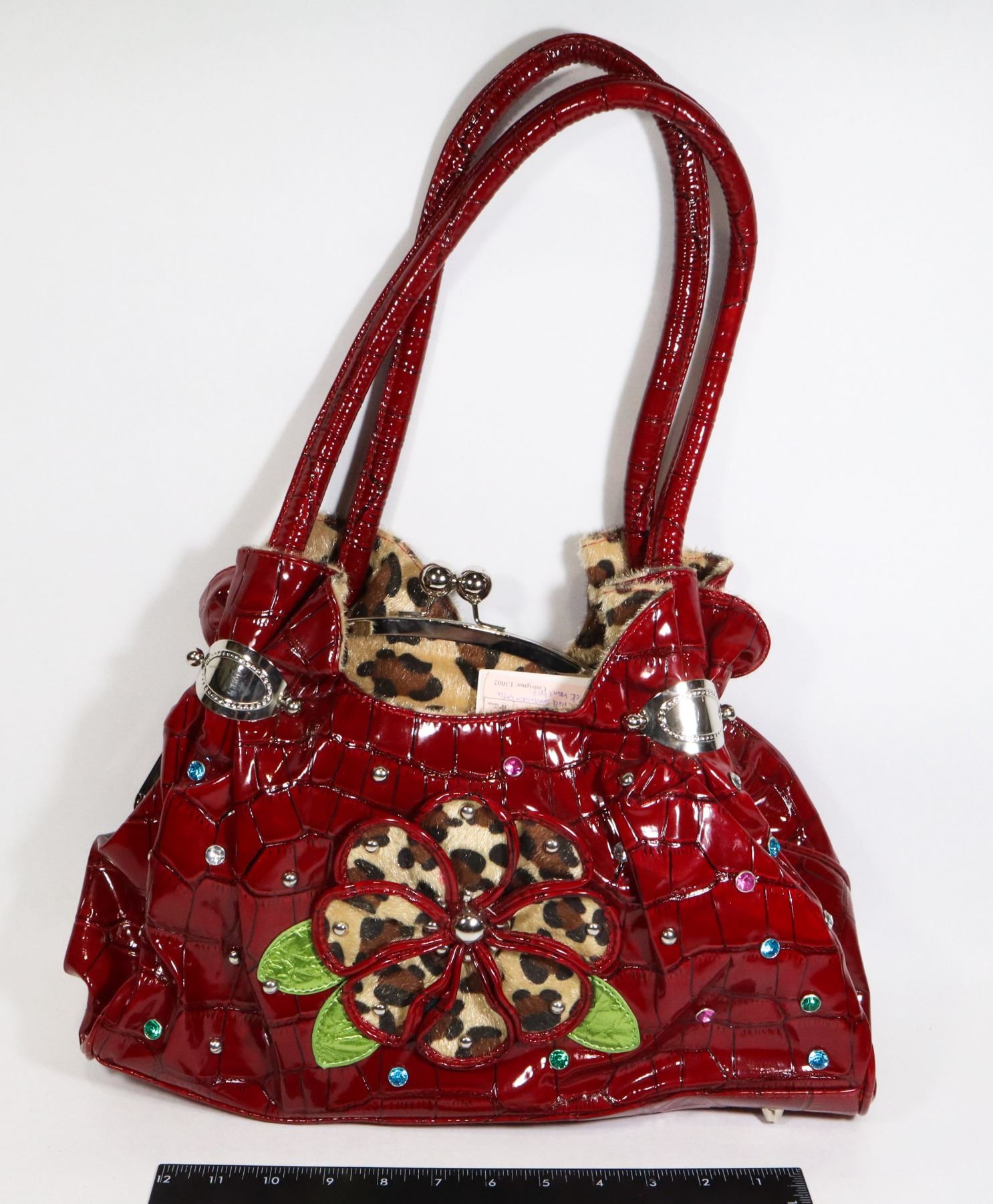 LOCK HANDBAG WITH FLOWER DESIGN AND STUD/RHINESTONE ACCENTS.