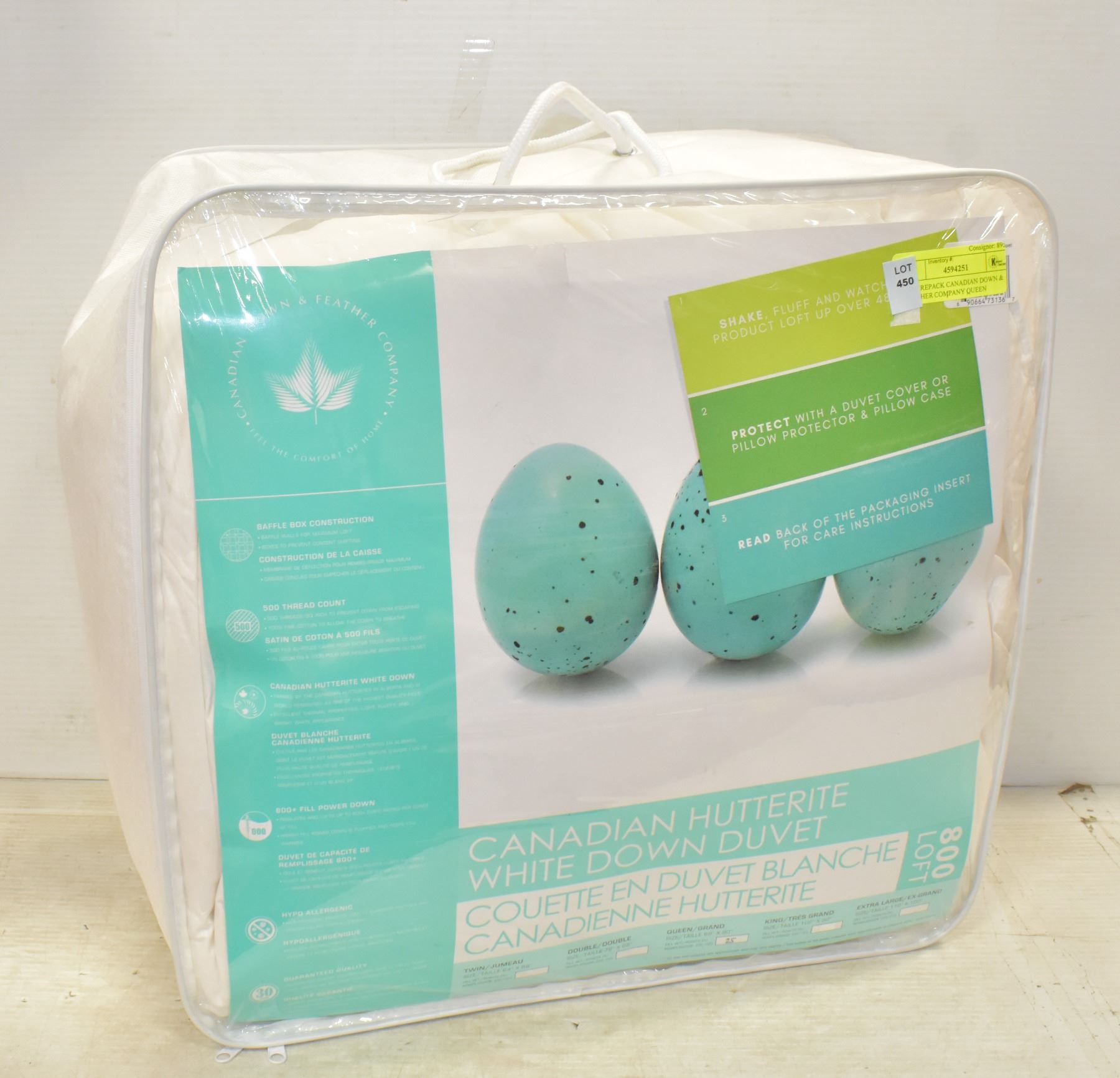 ALL SEASONS 800 LOFT HUTTERITE DUVET. 500 THREAD COUNT, 100% COTTON. HYPO-ALLERGENIC . FILLED WITH DUCK DOWN. MEASURES 88"X90". MADE IN CANADA. MSRP $1100. HBC SES **ALL ITEMS MUST BE REMOVED BY 5PM MONDAY, SEPTEMBER 10, 2022. ALL REMAINING ITEMS WILL BE SUBJECT TO A $6.00 PER DAY STORAGE CHARGE. ANY ITEMS REMAINING AFTER MONDAY, SEPTEMBER 10, 2022 WILL BE CONSIDERED FORFEITED. NO REFUNDS WILL BE ISSUED FOR FORFEITED ITEMS.TO SCHEDULE A PICK UP APPOINTMENT CLICK HERE