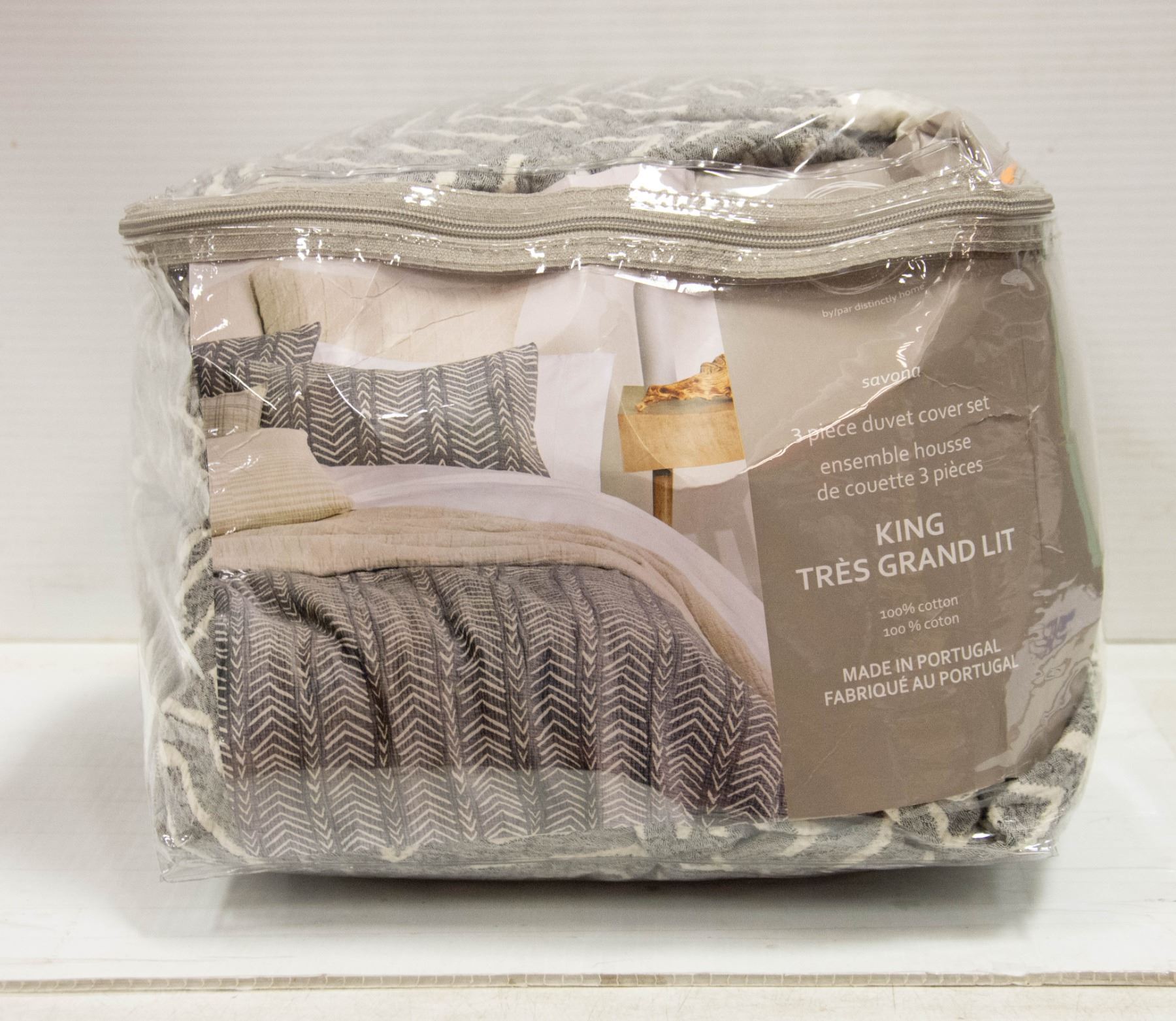 SIZE DUVET COVER SET, SAVONA DESIGN, 100% COTTON, 2 KING SHAMS 21 X 37", DUVET COVER 110 X 90", MACHINE WASHABLE, HBC SES, MSRP. $279.99 **ALL ITEMS MUST BE REMOVED BY 5PM SATURDAY, DECEMBER 3RD, 2022. ALL REMAINING ITEMS WILL BE SUBJECT TO A $6.00 PER DAY STORAGE CHARGE. ANY ITEMS REMAINING AFTER MONDAY, DECEMBER 18TH, 2022 WILL BE CONSIDERED FORFEITED. NO REFUNDS WILL BE ISSUED FOR FORFEITED ITEMS. TO SCHEDULE A PICK UP APPOINTMENT CLICK HERE