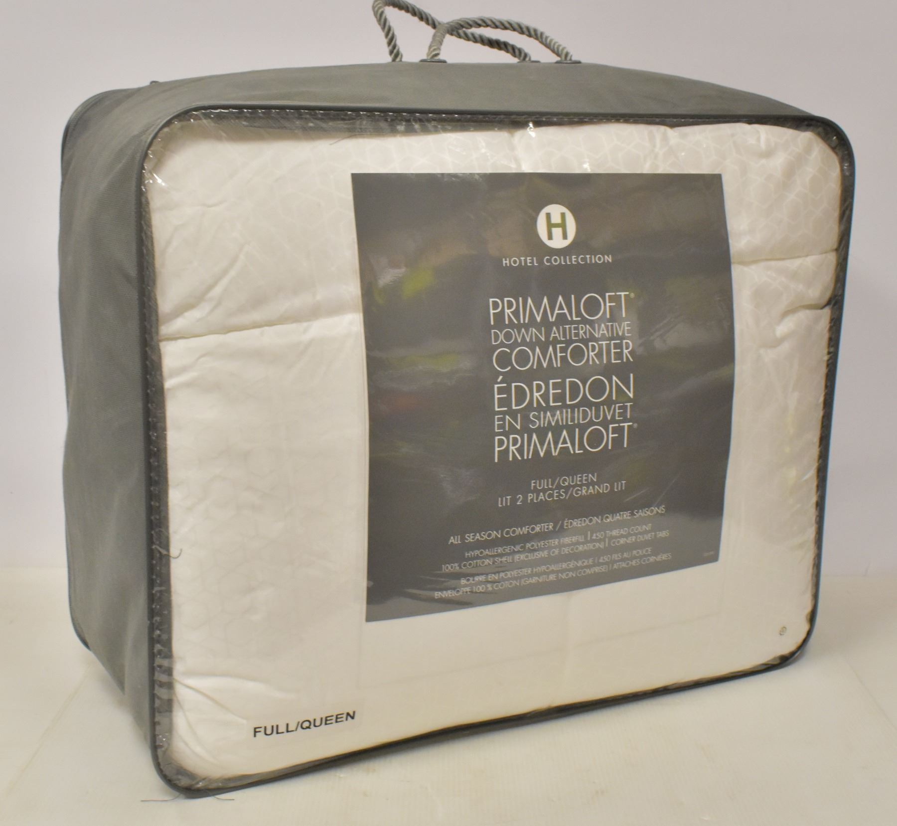 HOTEL COLLECTION PRIMALOFT DOWN ALTERNATIVE QUEEN (94X96") ALL SEASON COMFORTER. HYPOALLERGENIC POLYESTER FIBER FILL, 450 THREAD COUNT, 100% COTTON. MSRP $450. HBC SES