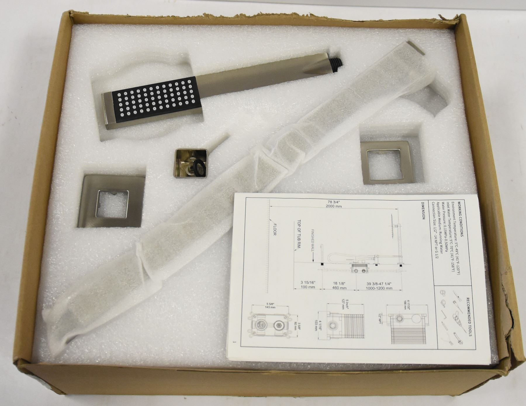 BRUSHED NICKEL FINISH, APPROX. 8" SQUARE MAIN HEAD, PULL OUT HAND WAND, FAUCET SPOUT WITH CONTROL SWITCH, ALL PARTS CONFIRMED, MODEL SB6305-BN-TEM1