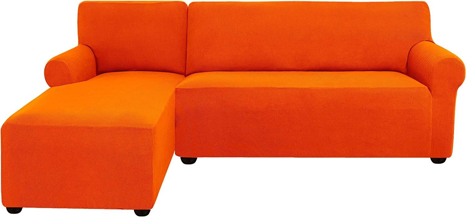 ORANGE COLOUR, LEFT SIDE CHAISE, STRETCHY MATERIAL, SEE PICTURES FOR DIMENSIONS