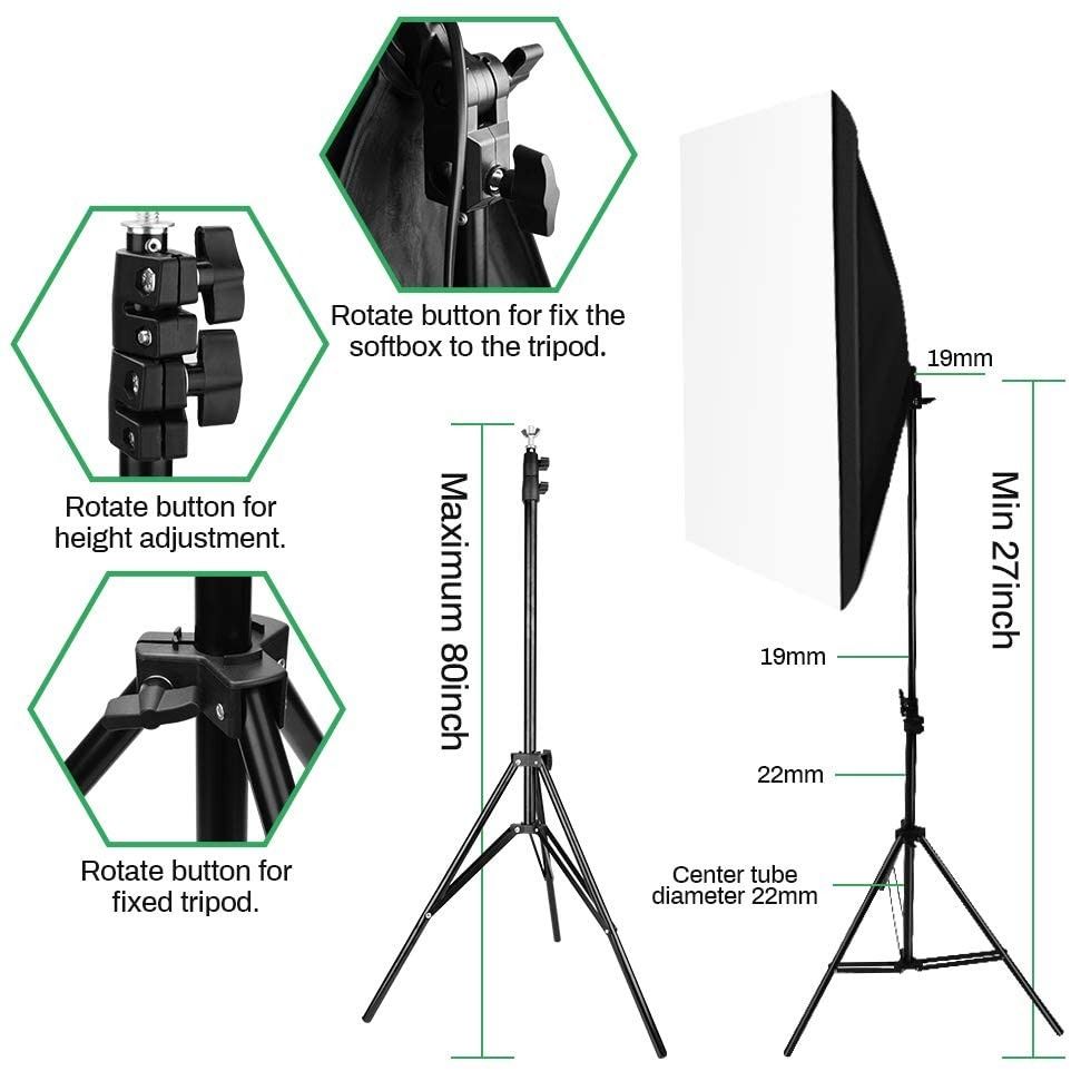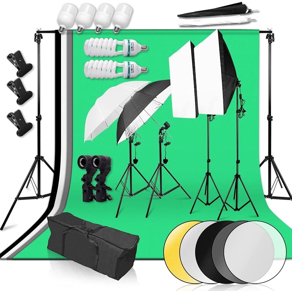 KIT, FOR PHOTO SHOOTS, VIDEO SHOOTS, STREAMING, GREEN SCREEN EFFECTS, APPROX. 6.6 X 6.6' BACKDROP BACKGROUND, GREEN, BLACK, WHITE AND GREY, SOFTBOX LIGHTING KIT, UMBRELLAS, CLAMPS, SHADES, FRAME, CARRYING BAG, LIGHTS, *ONE OF THE 110W BULBS BROKE IN TRANSPORT* ALL OTHR PARTS CONFIRMED, INSTRUCTION MANUAL INCLUDED