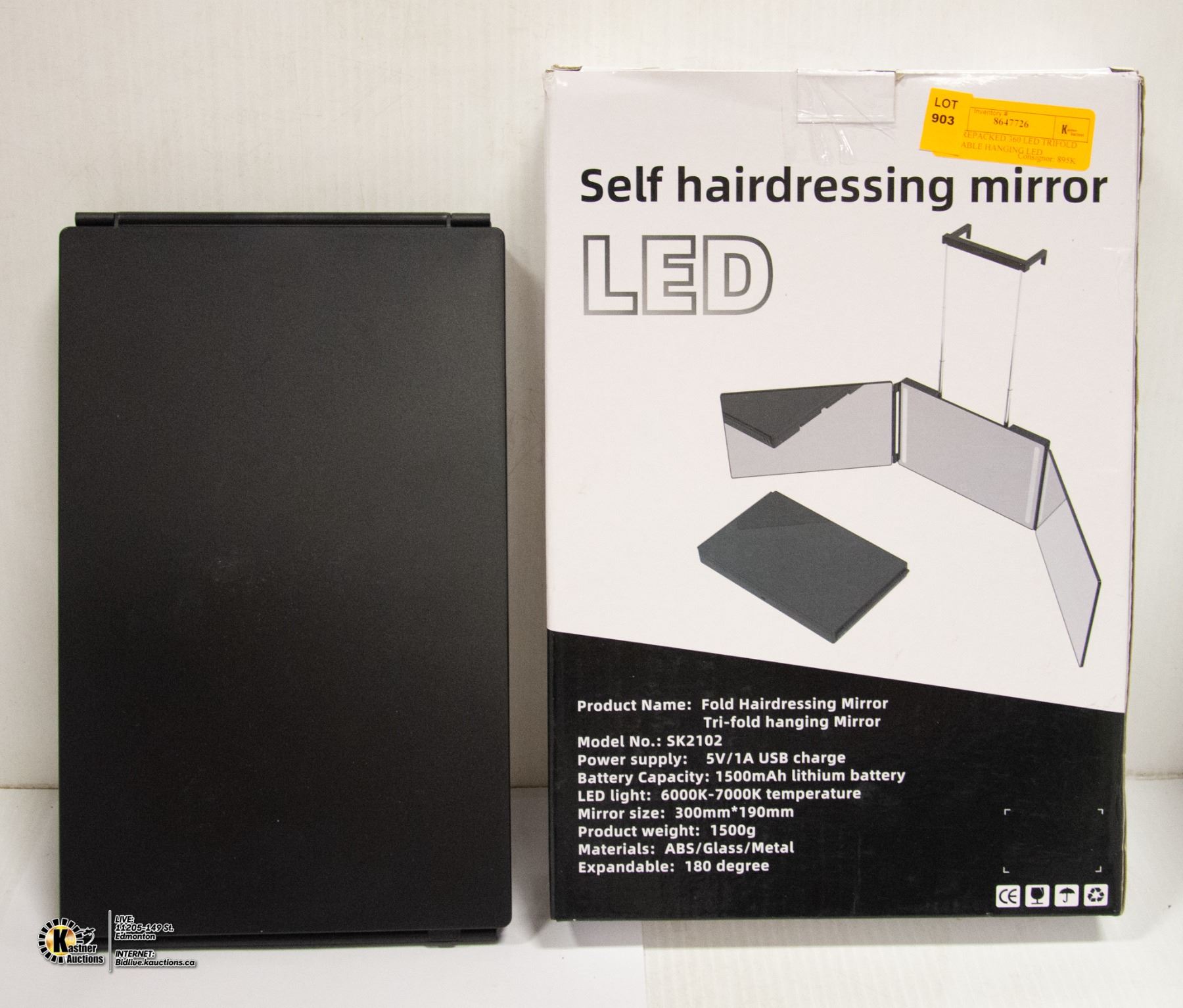 LIT MIRROR, BLACK FRAME, COMES WITH PULLOUT HANGER AND HOOKS, EASY FOLD AWAY DESIGN FOR SPACE SAVING STORAGE, TESTED, AMZ SES