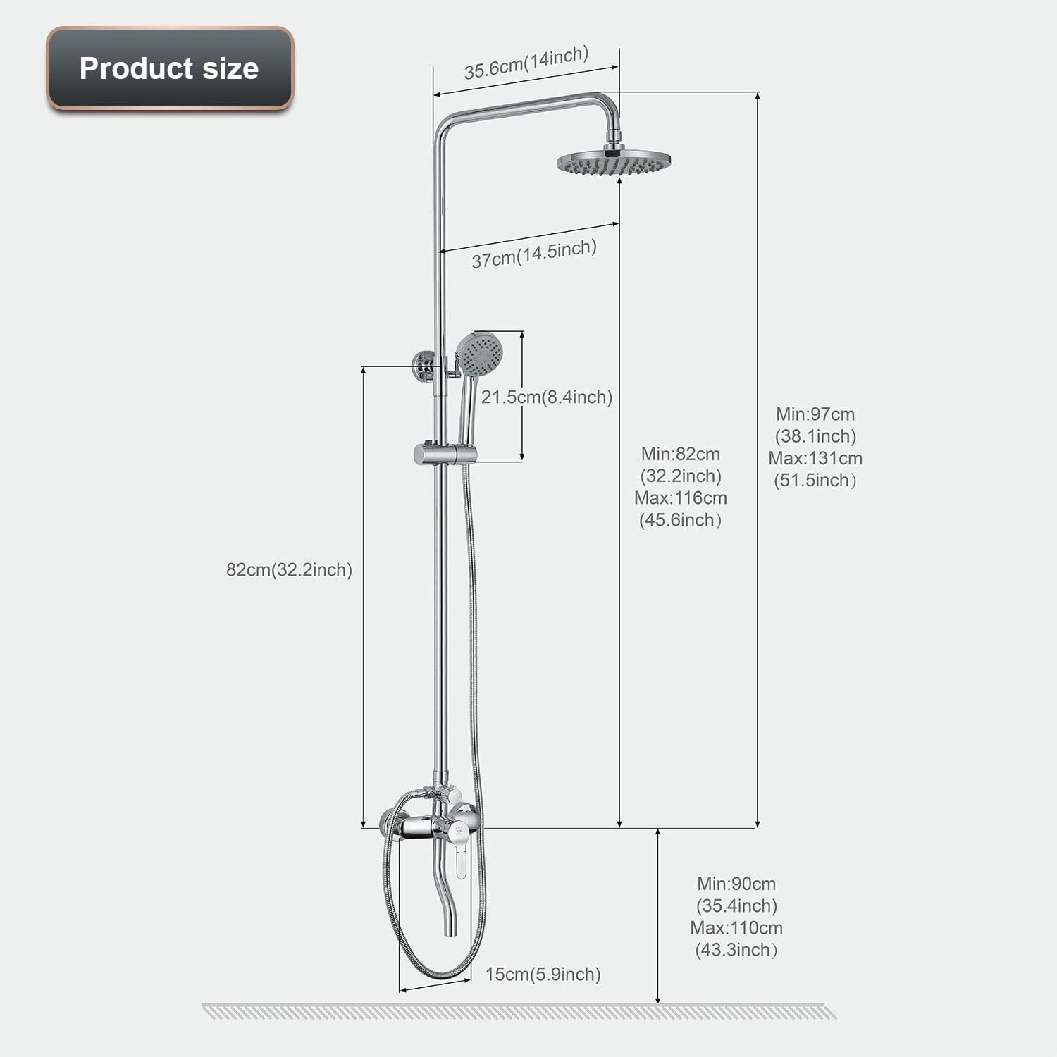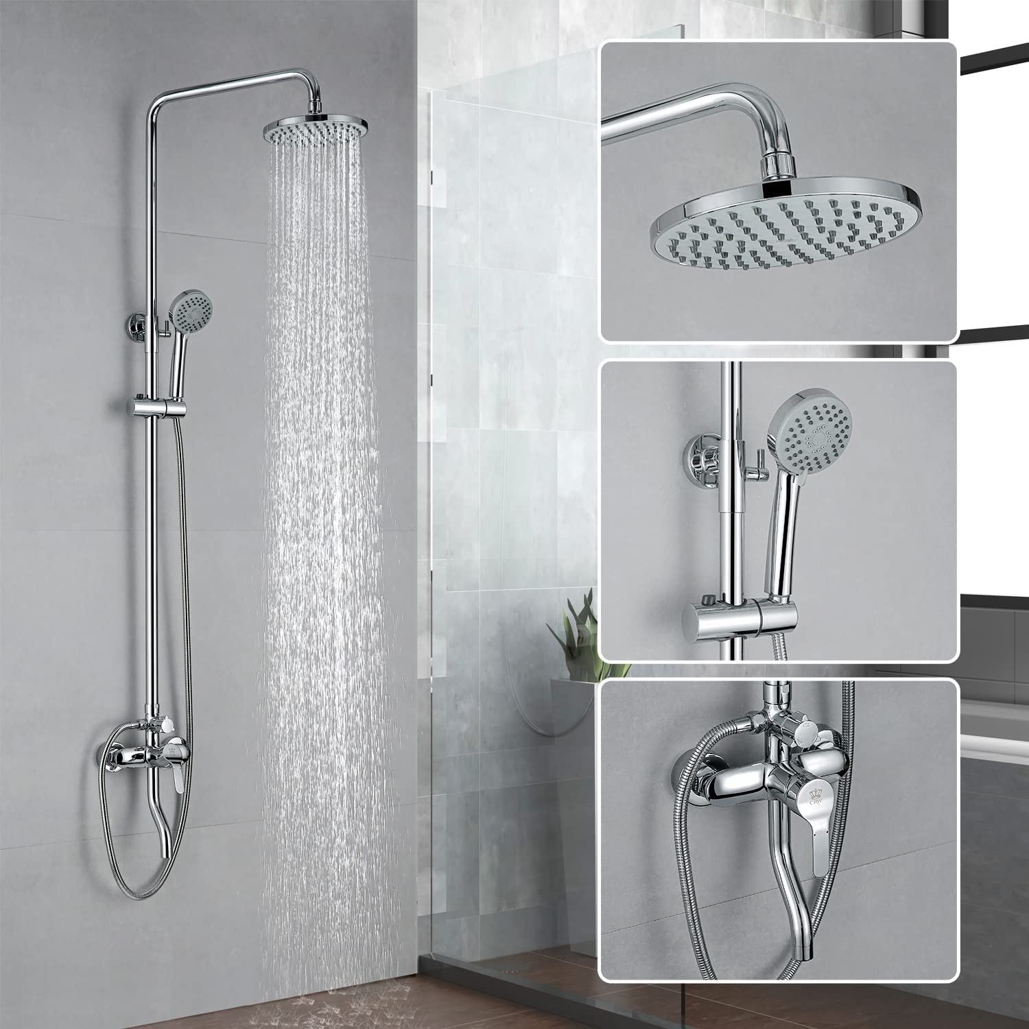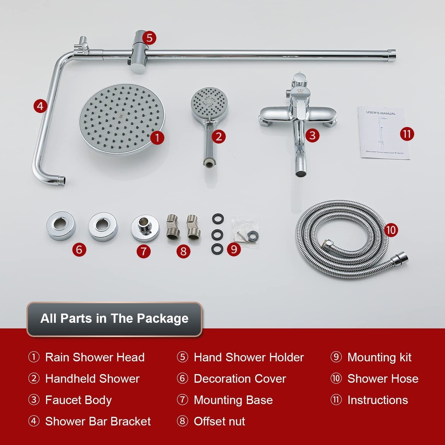 KIT WITH 8" RAINFALL SHOWER HEAD, 3 FUNCTION HAND WAND WITH HOSE, HEIGHT ADJUSTABLE WAND SETTING, CHROME FINISH, ALL MAIN PARTS CHECKED AND CONFIRMED, POSSIBLY MISSING 2 BLACK O RING/WASHERS AVAILABLE AT ANY HARDWARE STORE, AMZ SES