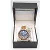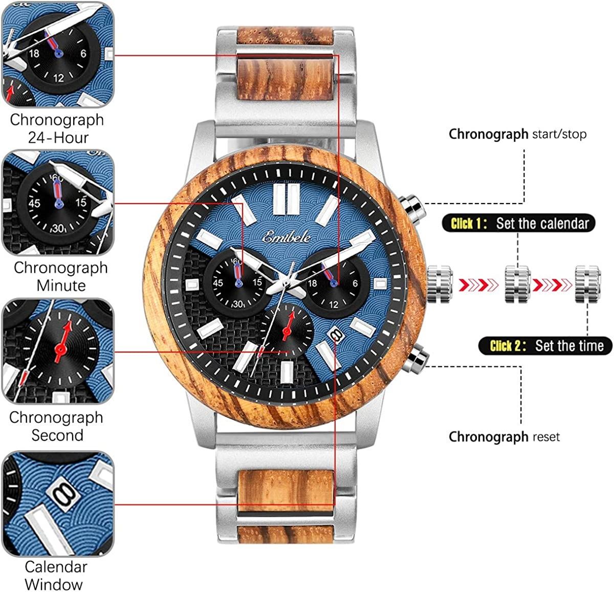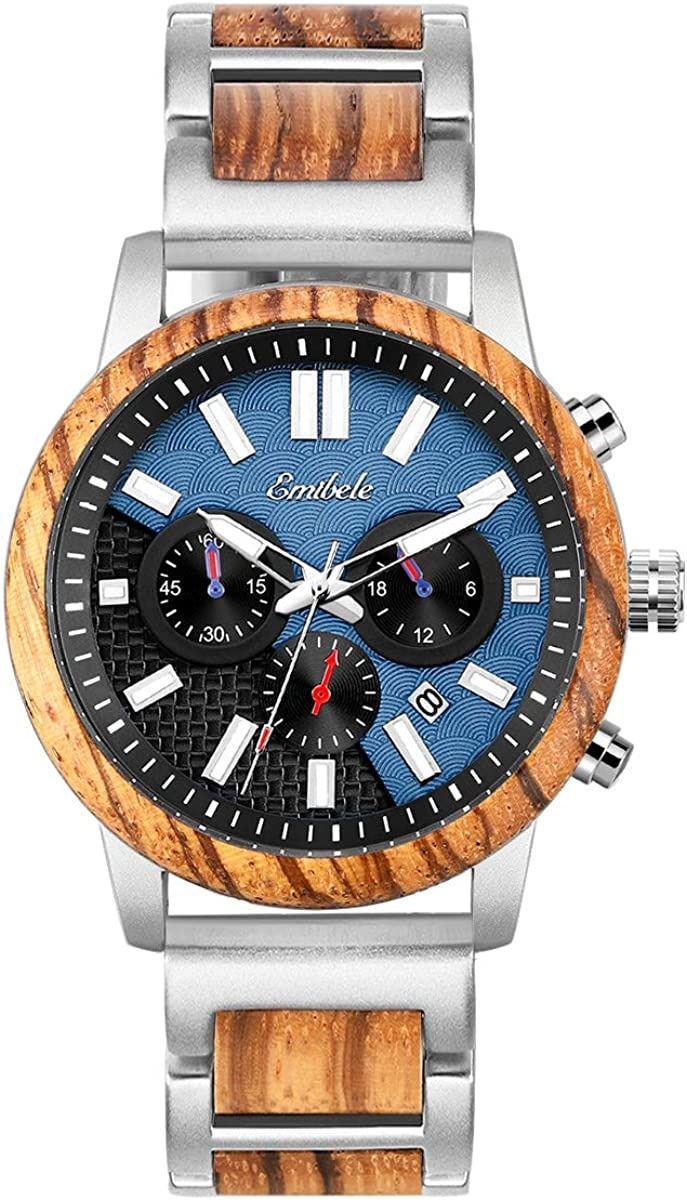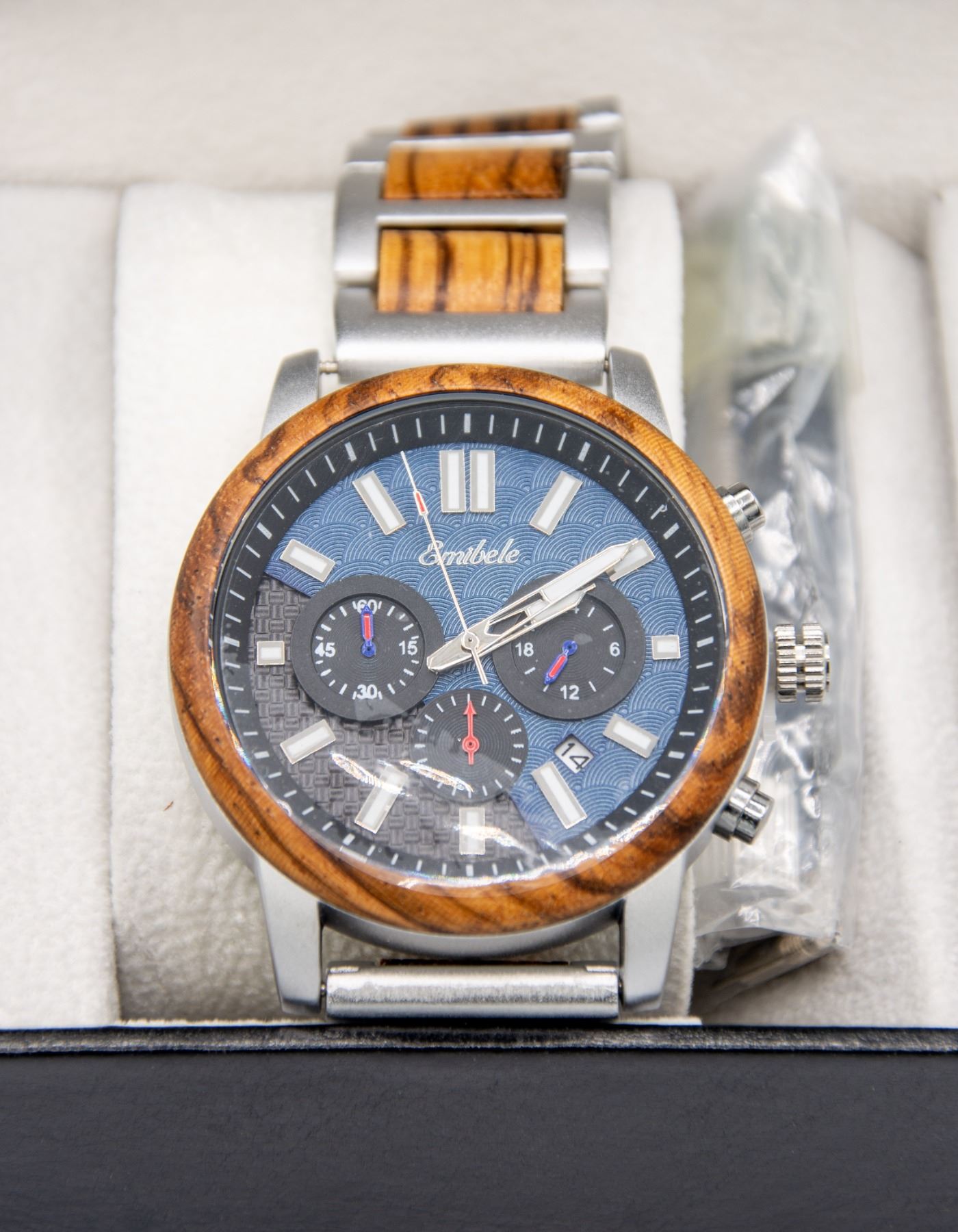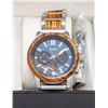 WRIST WATCH WITH WOOD AND STAINLESS STRAP THAT COMES WITH TOOL TO ADD OR REMOVE PINS, 2 TONE BLACK/BLUE FACE WITH LUMINOUS DIALS, COMES IN ORIGINAL STORAGE BOX WITH CLEANING CLOTH AND MANUAL, TESTED, AMZ SES