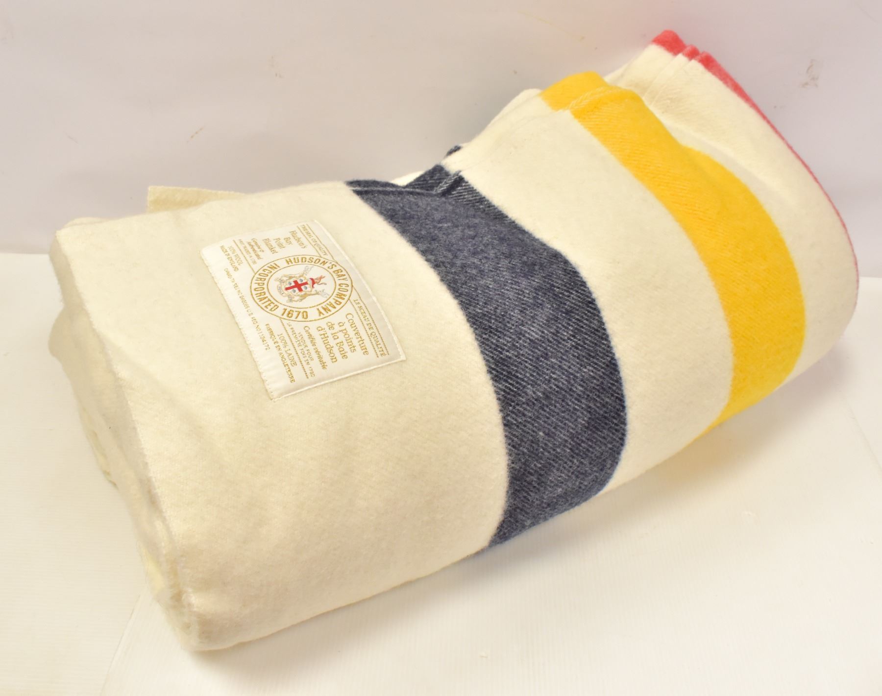 KING 8 POINTS, 100"X108". ICONIC MULTISTRIPED POINT BLANKET.WOVEN IN THE WOOL MILL IN ENGLAND. 100% WOOL. SUPERIOR WARMTH. MARKED WITH SEAL OF AUTHENTICITY. MADE IN ENGLAND. MSRP$ 550. HBC SES