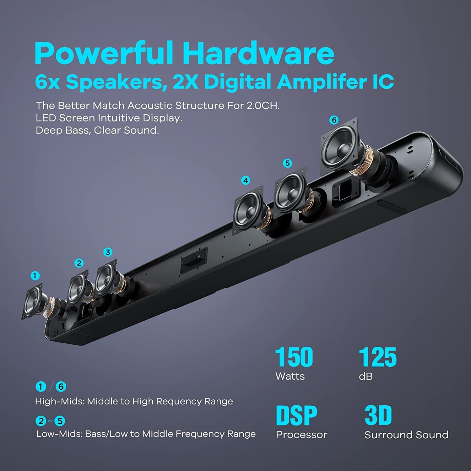FOR TV, 6 SPEAKERS, BLUETOOTH, BUILT IN SUB, CLEAR SOUND, NO NOISE DISTORTION TECHNOLOGY, 235DB DSP FOR TV, SURROUND SOUND, HDMI OPTICAL COAXIAL AUX, SOUND PROGRAMMING, REMOTE CONTROL, ALL CORDS AND MANUALS CONFIRMED, TESTED, SEALED PARTS WERE REPACKED, AMZ SES**ALL ITEMS MUST BE REMOVED BY 5PM FRIDAY, AUGUST 5TH, 2022. ALL REMAINING ITEMS WILL BE SUBJECT TO A $6.00 PER DAY STORAGE CHARGE. ANY ITEMS REMAINING AFTER FRIDAY, AUGUST 19, 2022 WILL BE CONSIDERED FORFEITED. NO REFUNDS WILL BE ISSUED FOR FORFEITED ITEMS.** TO SCHEDULE A PICK UP APPOINTMENT CLICK HERE