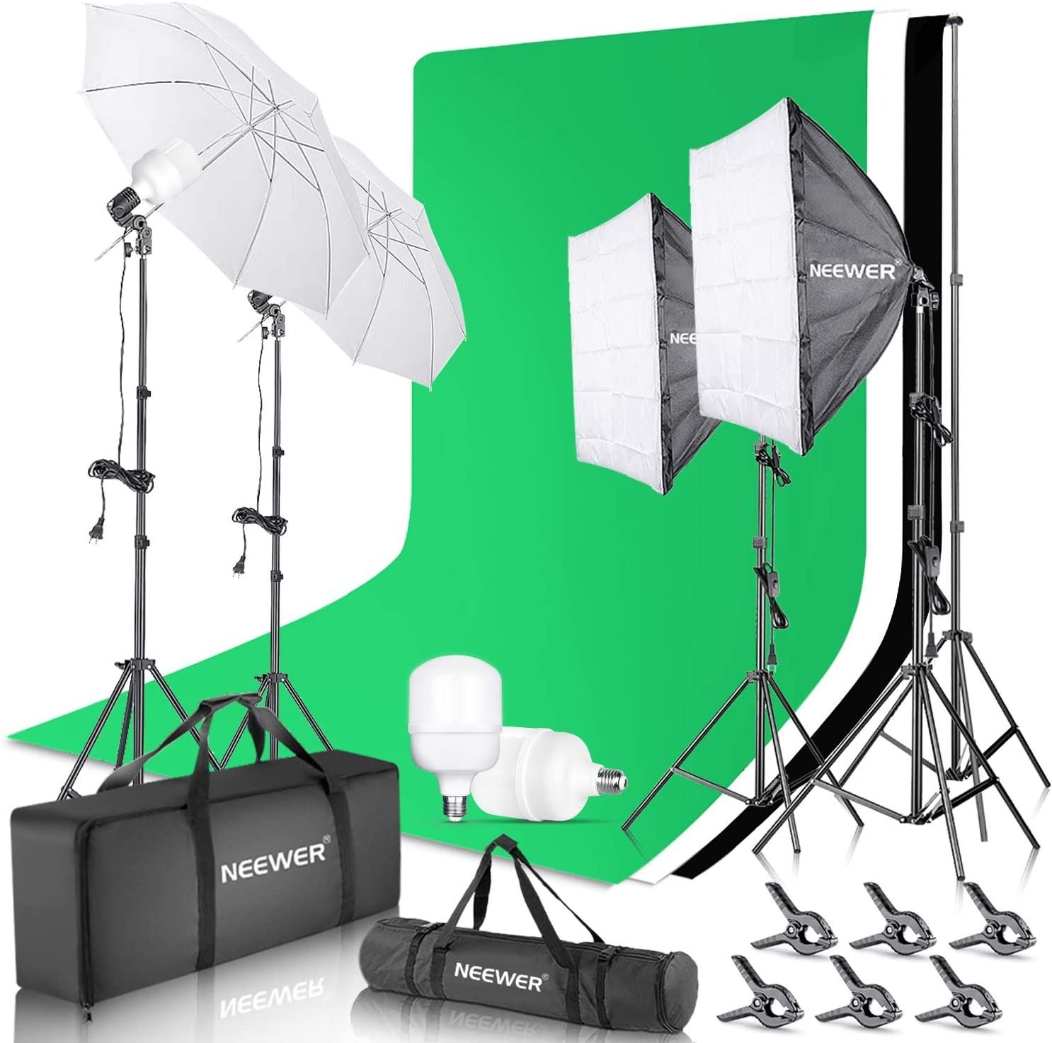 SYSTEM, 800W 5500K UMBRELLAS, SOFTBOX CONTINUOUS LIGHTING KIT, PROFESSIONAL COMPLETE SETUP FOR PHOTO STUDIO USE OR VIDEOGRAPHY, 3 BACKGROUND COLOURS WHITE/BLACK/GREEN, 4 TRIPOD STANDS FOR THE LIGHTS, 2 UMBRELLAS AND 2 SOFT BOXES WITH 45W BULBS AND DIFFUSERS, 2 CARRYING CASE BAGS, PARTS CONFIRMED, AMZ SES, MSRP. $355.49
