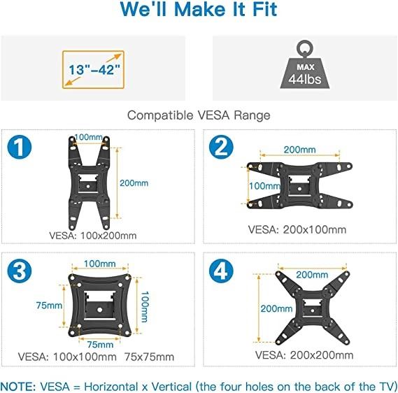 FITS MOST 13 - 42" LED/LCD MONITORS/TV'S, MAX VESA 200 X 200, 44LB MAX, MANUAL CONFIRMED, AMZ SES **MISSING A SINGLE SCREW FROM THE HARDWARE, ALL OTHER PARTS CONFIRMED**