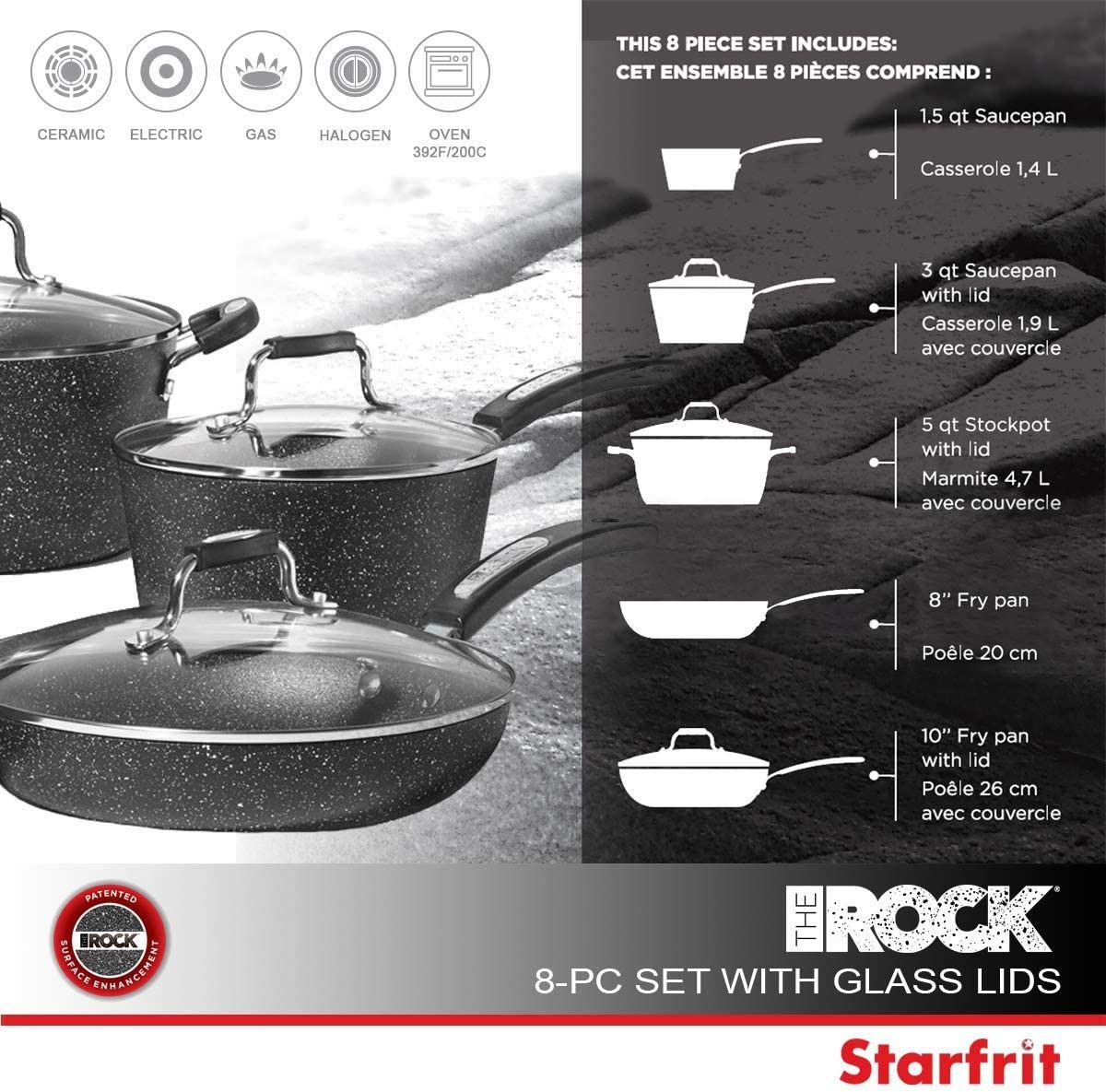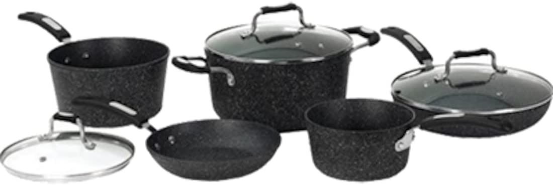 SET WITH BAKELITE HANDLE, FORGED ALUMINUM BASE, SCRATCH AND ABRASION RESISTANT, ALL PARTS CONFIRMED, INCLUDES 1.5QT SAUCE PAN, 3QT SAUCE PAN W/LID, 5QT STOCK POT W/LID, 8" AND 10" FRYING PANS WITH A LID, AMZ SES
