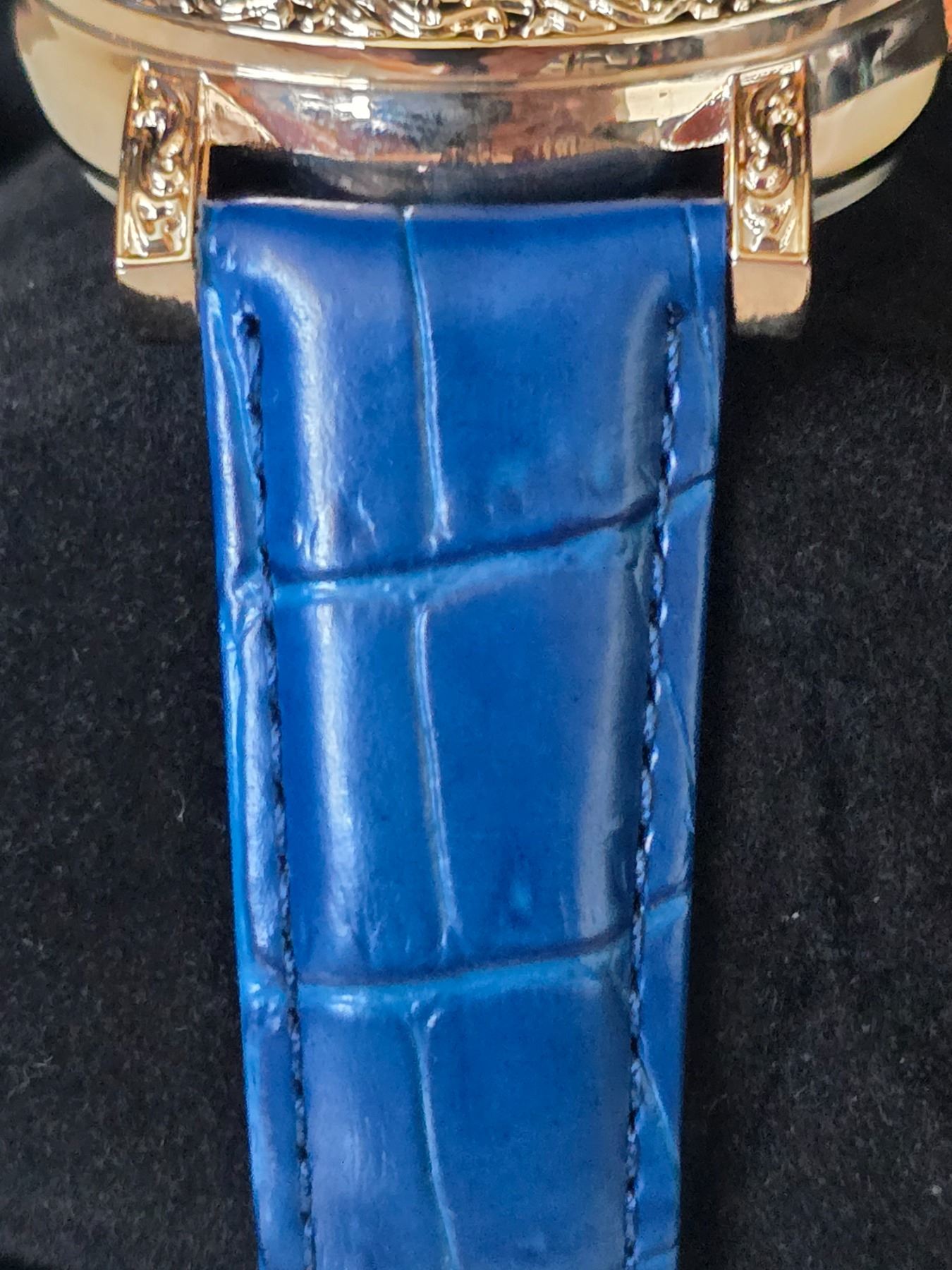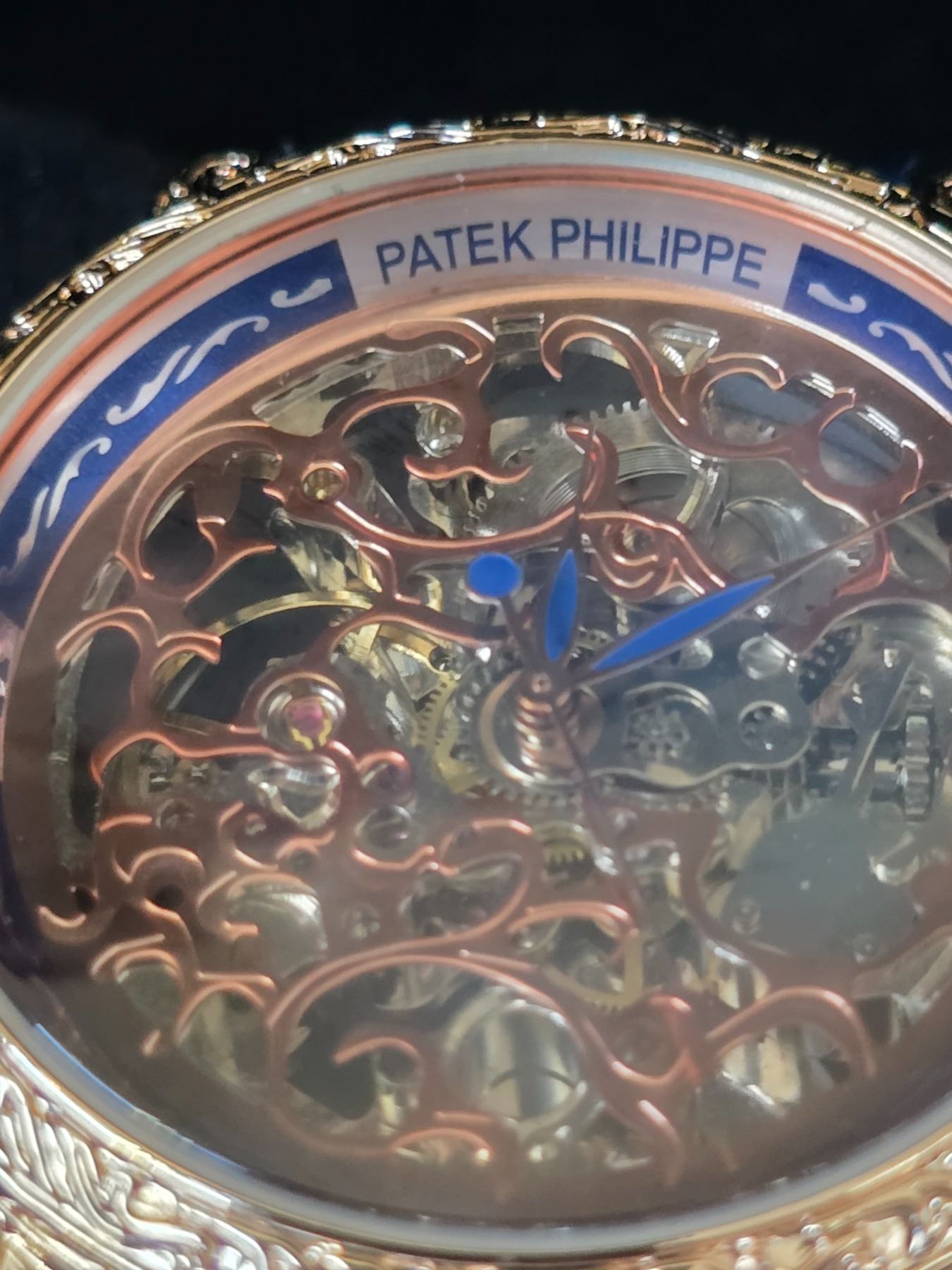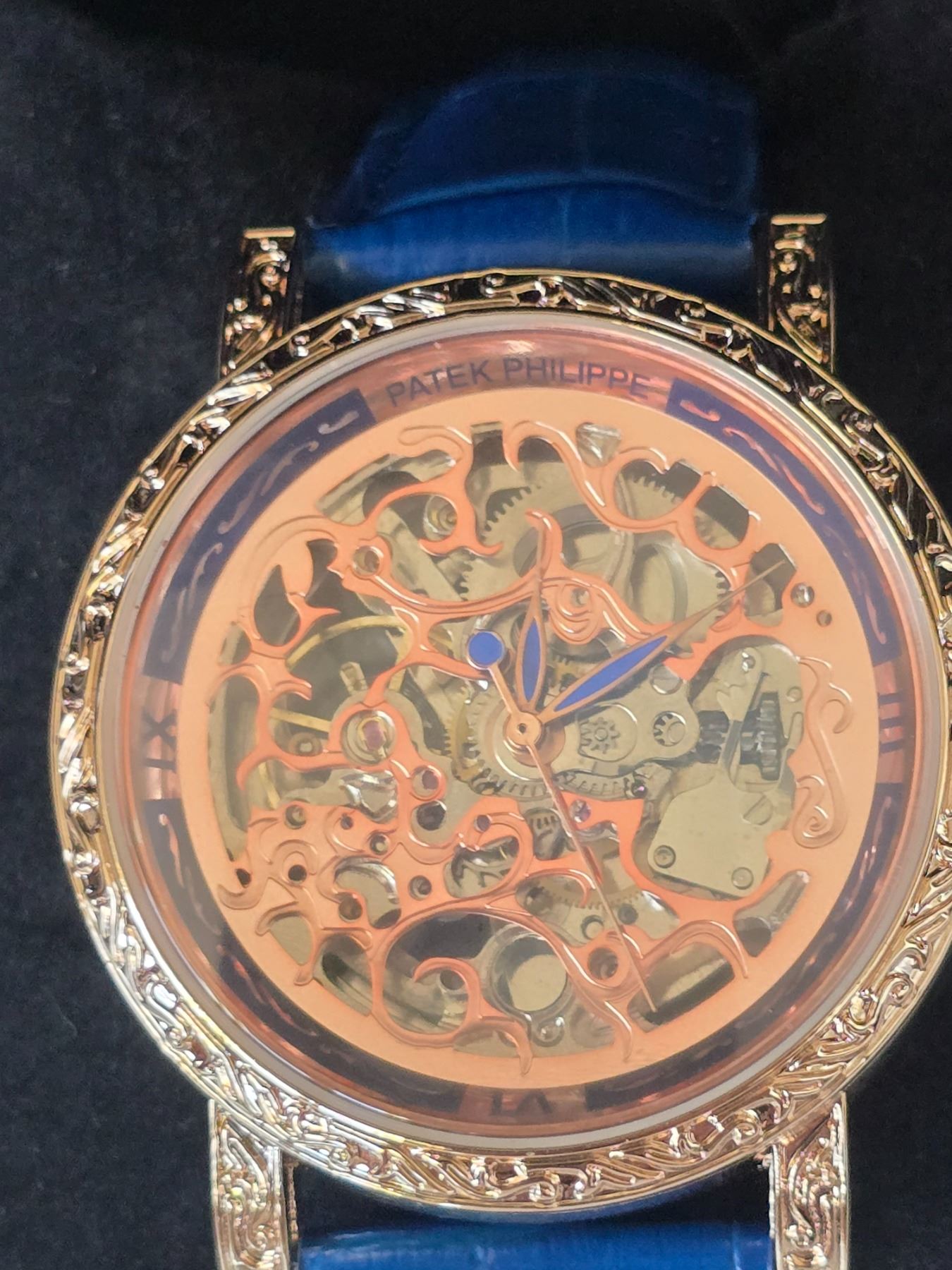 NEW REPLICA AUTOMATIC PATEK PHILIPPE NAUTILUS SKELETON FACE AND BACK REPLICA WATCH. ROSE GOLD CASE AND DIAL. BLUE LEATHER STRAP. NEW WATCH IN BOX.