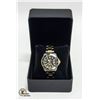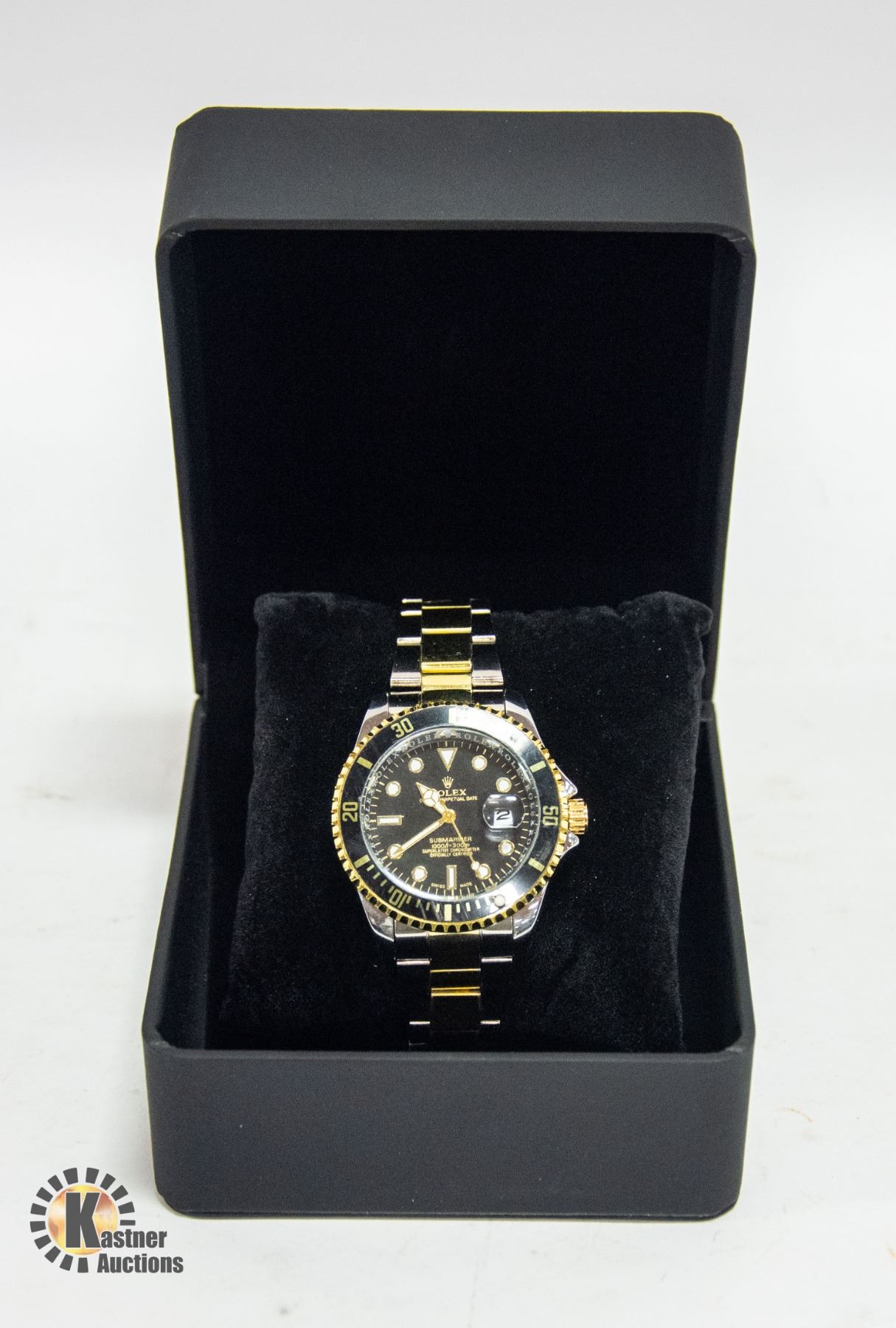 CHRONOMETER STAINLESS STEEL BACK WATER RESISTANT WITH BLACK AND GOLD BEZEL WITH BLACK FACE WITH STEEL BAND AND WATCH BOX **ALL ITEMS MUST BE REMOVED BY 5PM SATURDAY, JANUARY 13TH 2023. ALL REMAINING ITEMS WILL BE SUBJECT TO A $6.00 PER DAY STORAGE CHARGE. ANY ITEMS REMAINING AFTER MONDAY, JANUARY 29TH, 2023 WILL BE CONSIDERED FORFEITED. NO REFUNDS WILL BE ISSUED FOR FORFEITED ITEMS. TO SCHEDULE A PICK UP APPOINTMENT CLICK HERE