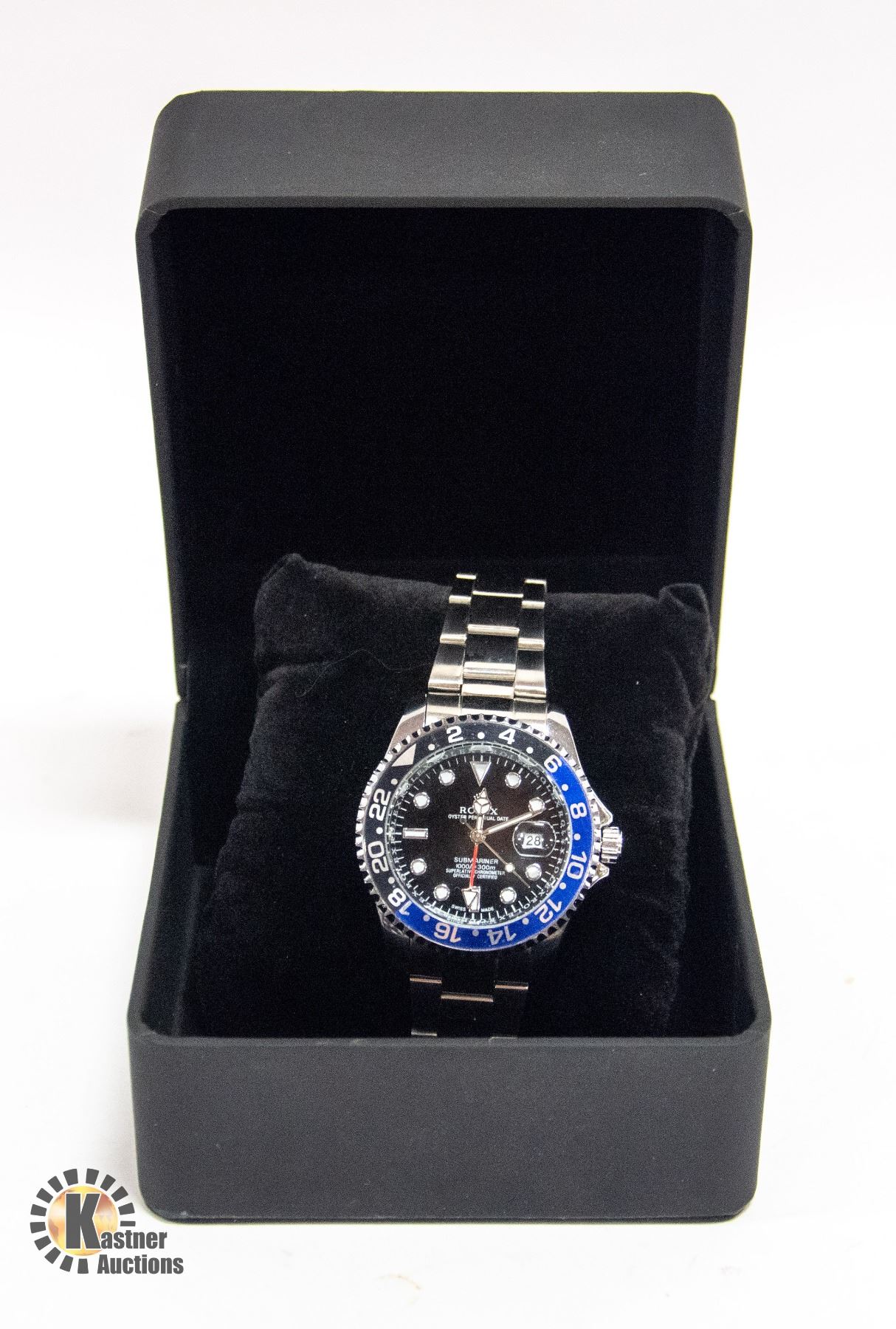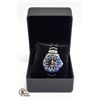 CHRONOMETER STAINLESS STEEL BACK WATER RESISTANT WITH BLACK AND BLUE BEZEL AND BLACK FACE WITH STEEL BAND AND WATCH BOX **ALL ITEMS MUST BE REMOVED BY 5PM SATURDAY, JANUARY 6TH 2023. ALL REMAINING ITEMS WILL BE SUBJECT TO A $6.00 PER DAY STORAGE CHARGE. ANY ITEMS REMAINING AFTER MONDAY, JANUARY 22ND, 2023 WILL BE CONSIDERED FORFEITED. NO REFUNDS WILL BE ISSUED FOR FORFEITED ITEMS. TO SCHEDULE A PICK UP APPOINTMENT CLICK HERE