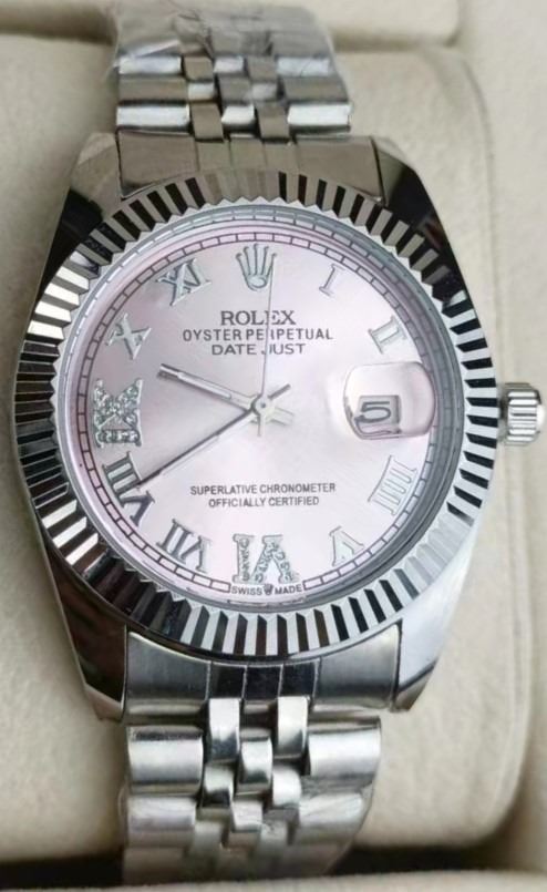 STAINLESS STEEL BACK WITH LIGHT PINK DIAL.