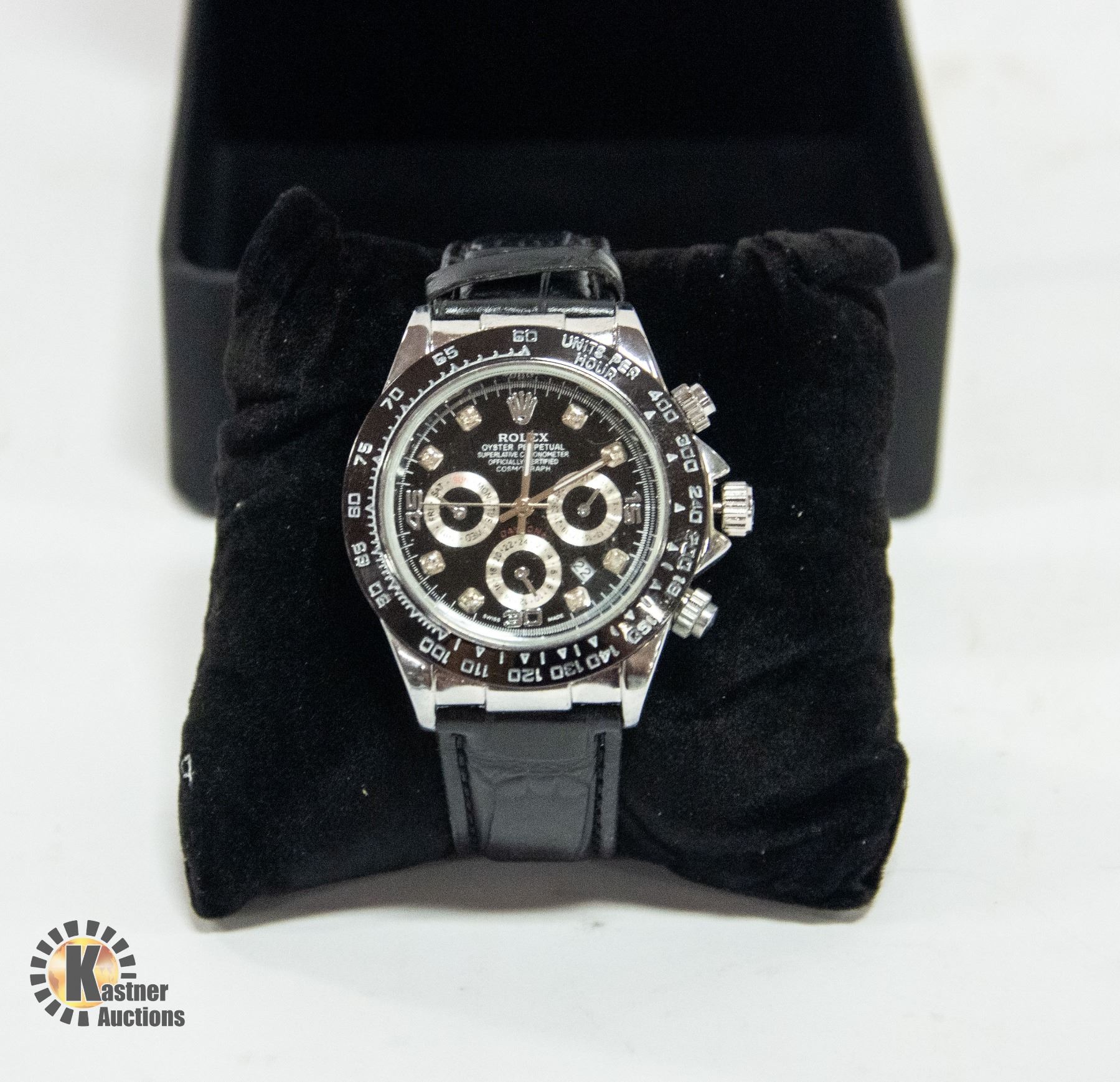 QUAD OYSTER GENUINE LEATHER STRAP BLACK BEZEL AND FACE WITH WATCH BOX **ALL ITEMS MUST BE REMOVED BY 5PM SATURDAY, FEBRUARY 3RD 2024. ALL REMAINING ITEMS WILL BE SUBJECT TO A $6.00 PER DAY STORAGE CHARGE. ANY ITEMS REMAINING AFTER MONDAY, FEBRUARY 19TH, 2023 WILL BE CONSIDERED FORFEITED. NO REFUNDS WILL BE ISSUED FOR FORFEITED ITEMS. TO SCHEDULE A PICK UP APPOINTMENT CLICK HERE