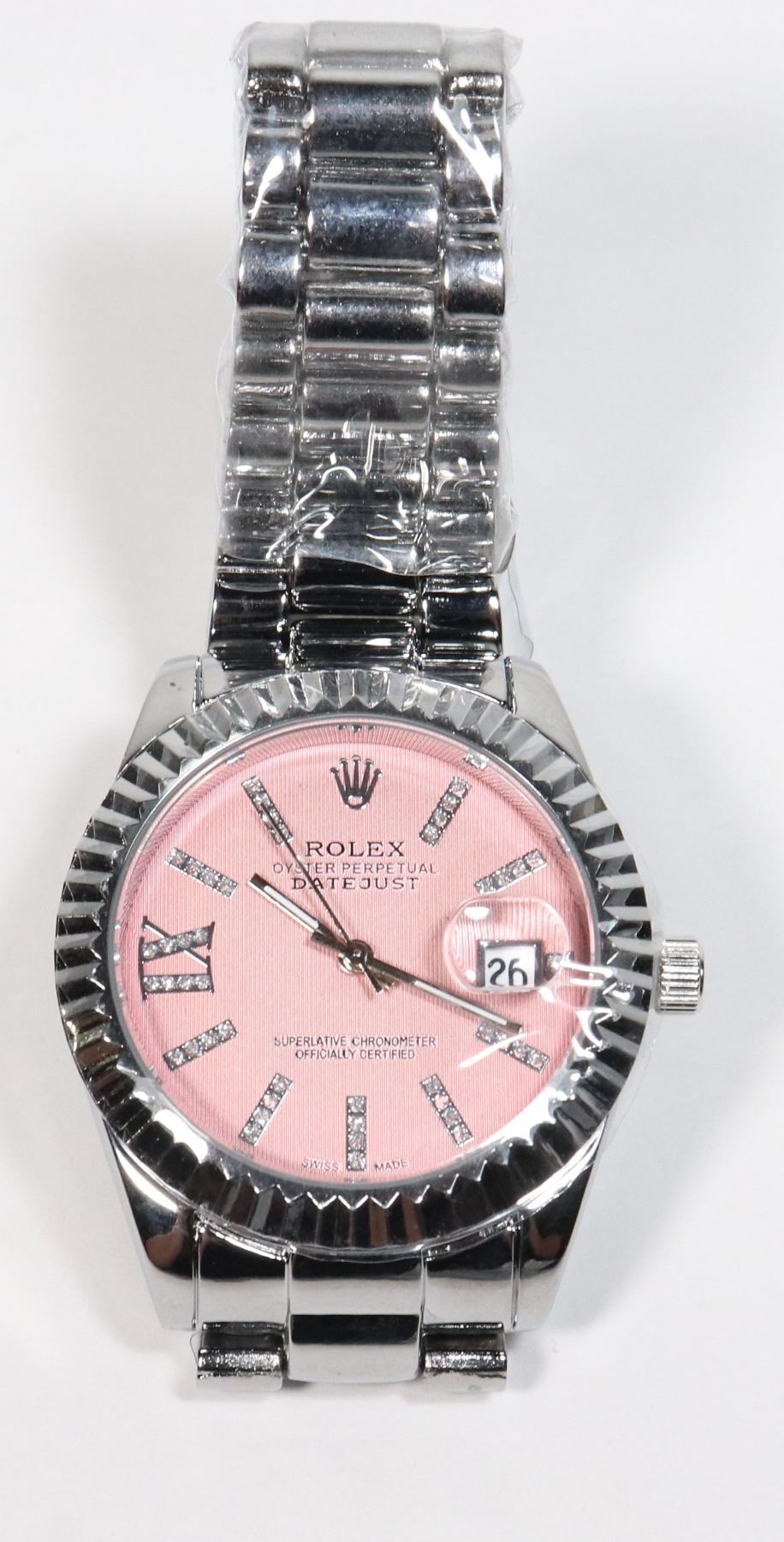 OFFICIALLY CERTIFIED OYSTER PERPETUAL SILVER STRAP AND PINK FACE W/ RHINESTONES REPLICA WATCH **ALL ITEMS MUST BE REMOVED BY 5PM SATURDAY, MAY 17TH 2025. ALL REMAINING ITEMS WILL BE SUBJECT TO A $6.00 PER DAY STORAGE CHARGE. ANY ITEMS REMAINING AFTER MONDAY, JUNE 2ND 2025 WILL BE CONSIDERED FORFEITED. NO REFUNDS WILL BE ISSUED FOR FORFEITED ITEMS. TO SCHEDULE A PICK UP APPOINTMENT CLICK HERE