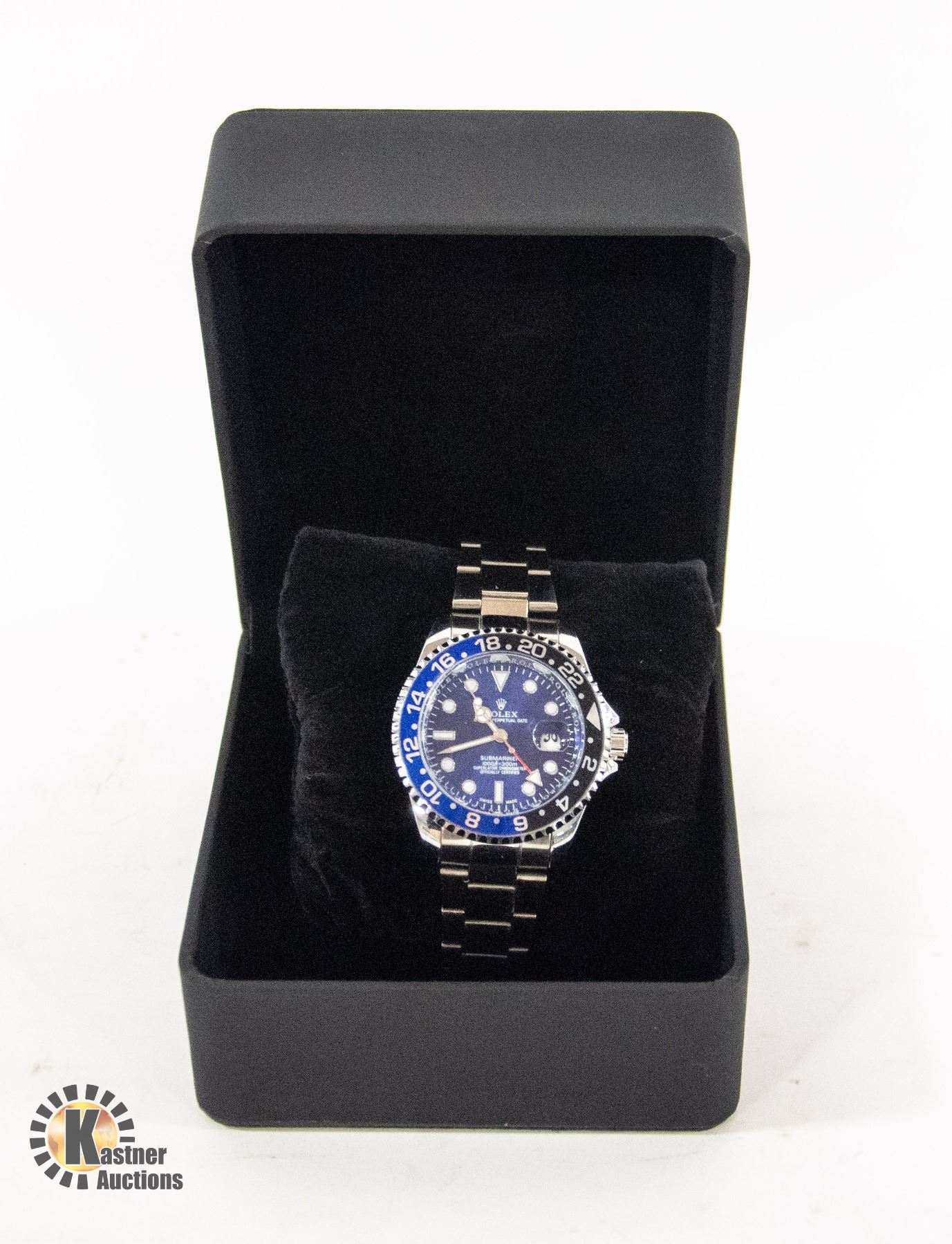 MOVEMENT SUPERLATIVE CHRONOMETER STAINLESS STEEL BACK WATER RESISTANT WITH BLUE BEZEL AND FACE STEEL BAND WITH WATCH BOX **ALL ITEMS MUST BE REMOVED BY 5PM SATURDAY, FEBRUARY 10TH 2024. ALL REMAINING ITEMS WILL BE SUBJECT TO A $6.00 PER DAY STORAGE CHARGE. ANY ITEMS REMAINING AFTER MONDAY, FEBRUARY 26TH, 2023 WILL BE CONSIDERED FORFEITED. NO REFUNDS WILL BE ISSUED FOR FORFEITED ITEMS. TO SCHEDULE A PICK UP APPOINTMENT CLICK HERE