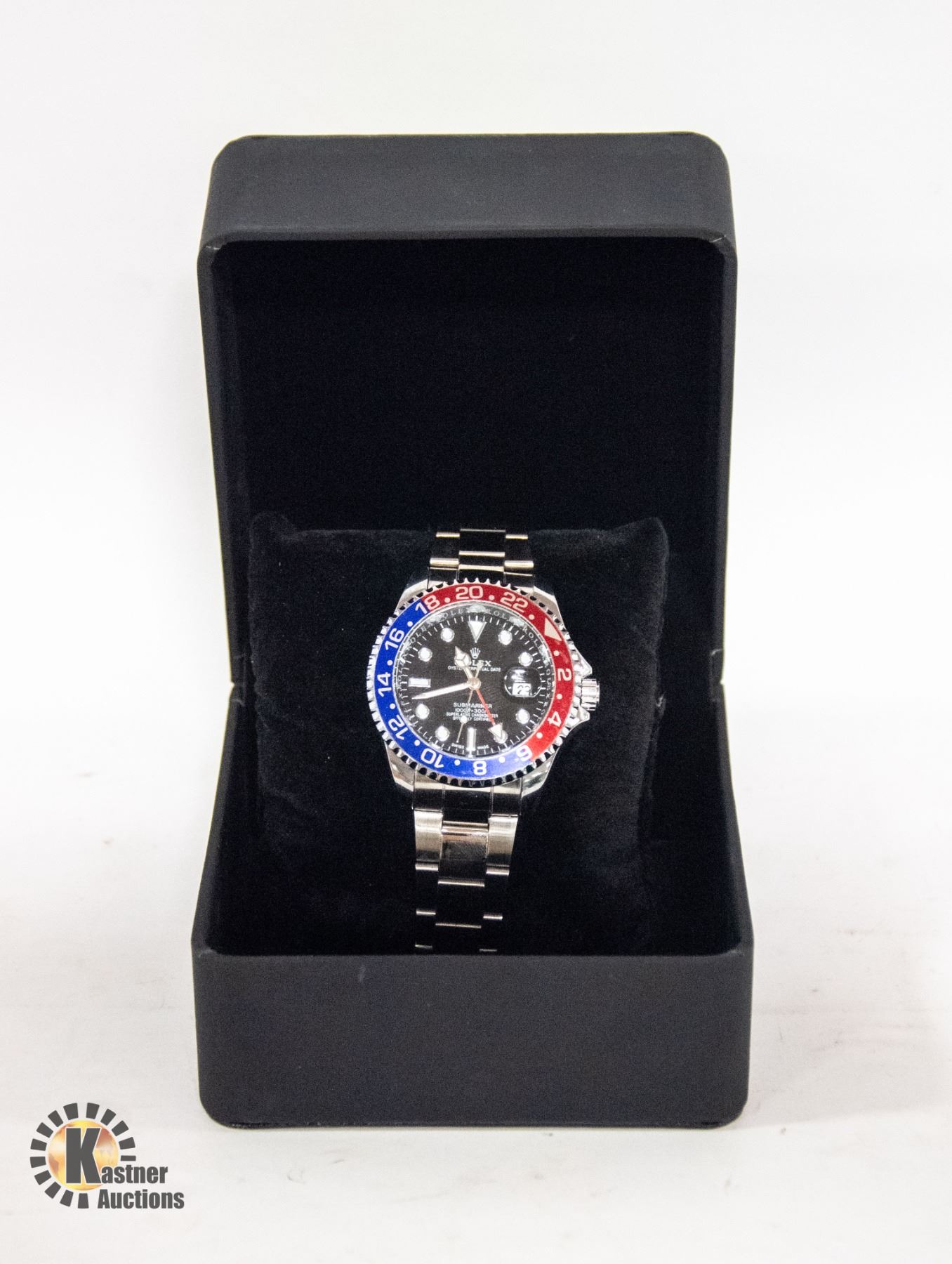 MOVEMENT SUPERLATIVE CHRONOMETER STAINLESS STEEL BACK WATER RESISTANT WITH BLUE AND RED BEZEL AND BLACK FACE STEEL BAND WITH WATCH BOX