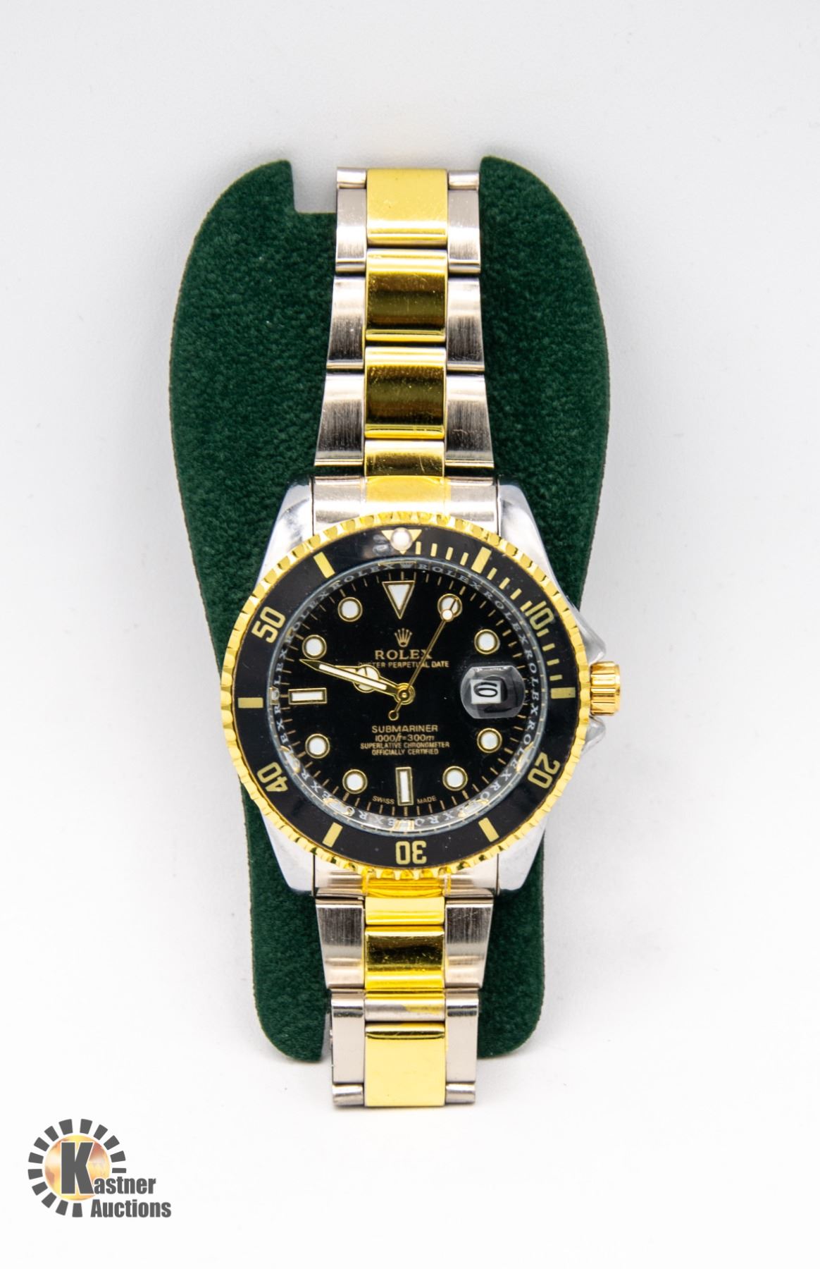 CHRONOMETER STAINLESS STEEL BACK WATER RESISTANT WITH GOLD BEZEL AND BLACK FACE WITH STEEL BAND AND PROTECTIVE POUCH **ALL ITEMS MUST BE REMOVED BY 5PM SATURDAY, DECEMBER 16TH 2023. ALL REMAINING ITEMS WILL BE SUBJECT TO A $6.00 PER DAY STORAGE CHARGE. ANY ITEMS REMAINING AFTER TUESDAY, JANUARY 2ND 2023 WILL BE CONSIDERED FORFEITED. NO REFUNDS WILL BE ISSUED FOR FORFEITED ITEMS. TO SCHEDULE A PICK UP APPOINTMENT CLICK HERE