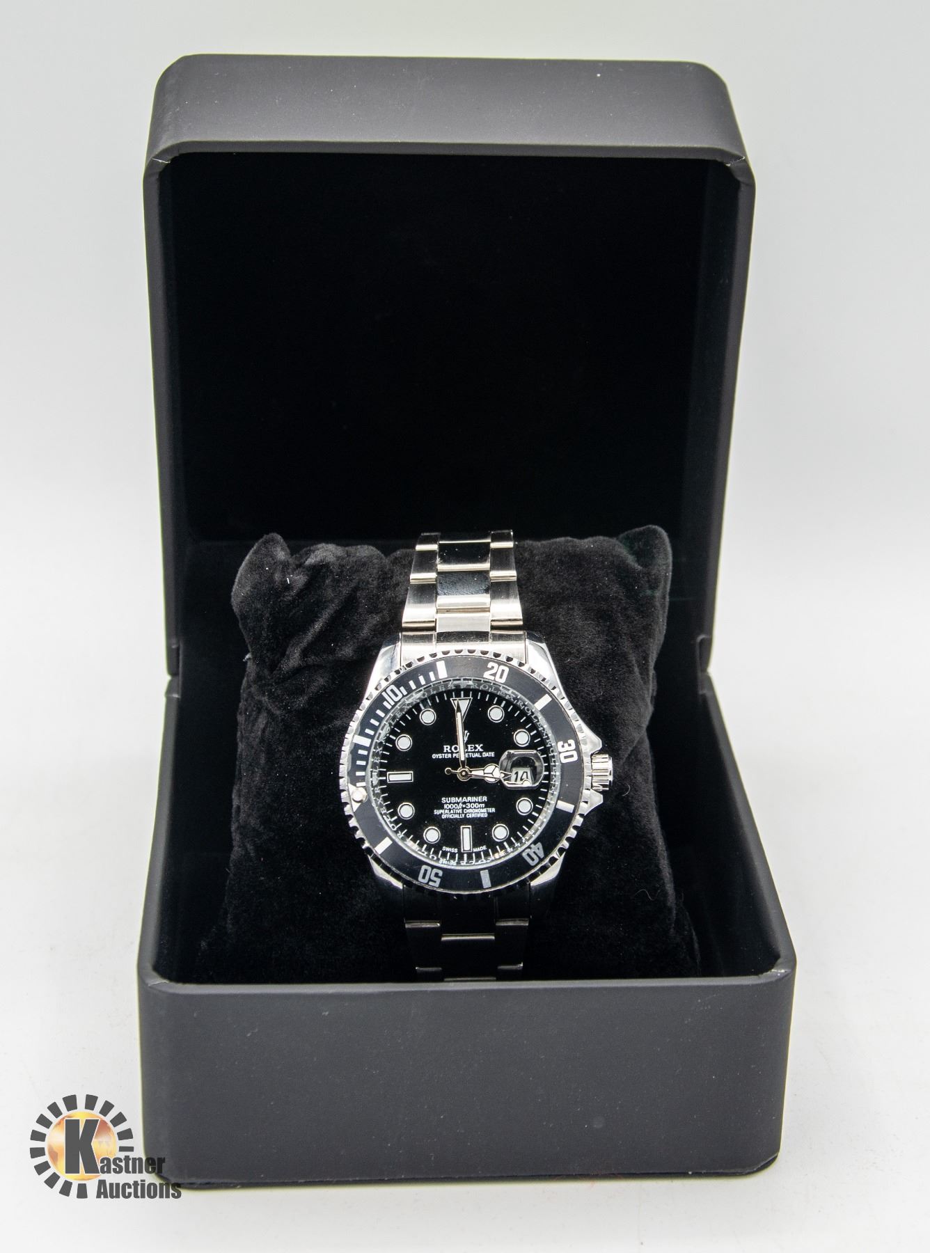 CHRONOMETER STAINLESS STEEL BACK WATER RESISTANT WITH BLACK BEZEL AND FACE WITH STEEL BAND AND WATCH BOX **ALL ITEMS MUST BE REMOVED BY 5PM SATURDAY, FEBRUARY 24TH 2024. ALL REMAINING ITEMS WILL BE SUBJECT TO A $6.00 PER DAY STORAGE CHARGE. ANY ITEMS REMAINING AFTER MONDAY, MARCH 11TH, 2023 WILL BE CONSIDERED FORFEITED. NO REFUNDS WILL BE ISSUED FOR FORFEITED ITEMS. TO SCHEDULE A PICK UP APPOINTMENT CLICK HERE