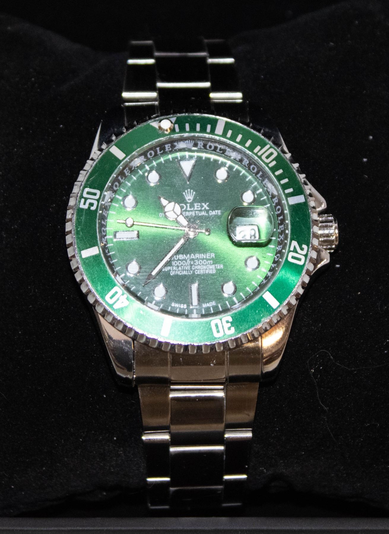 CHRONOMETER STAINLESS STEEL BACK WATER RESISTANT WITH GREEN BEZEL AND FACE WITH STEEL BAND WITH WATCH FACE IN BOX