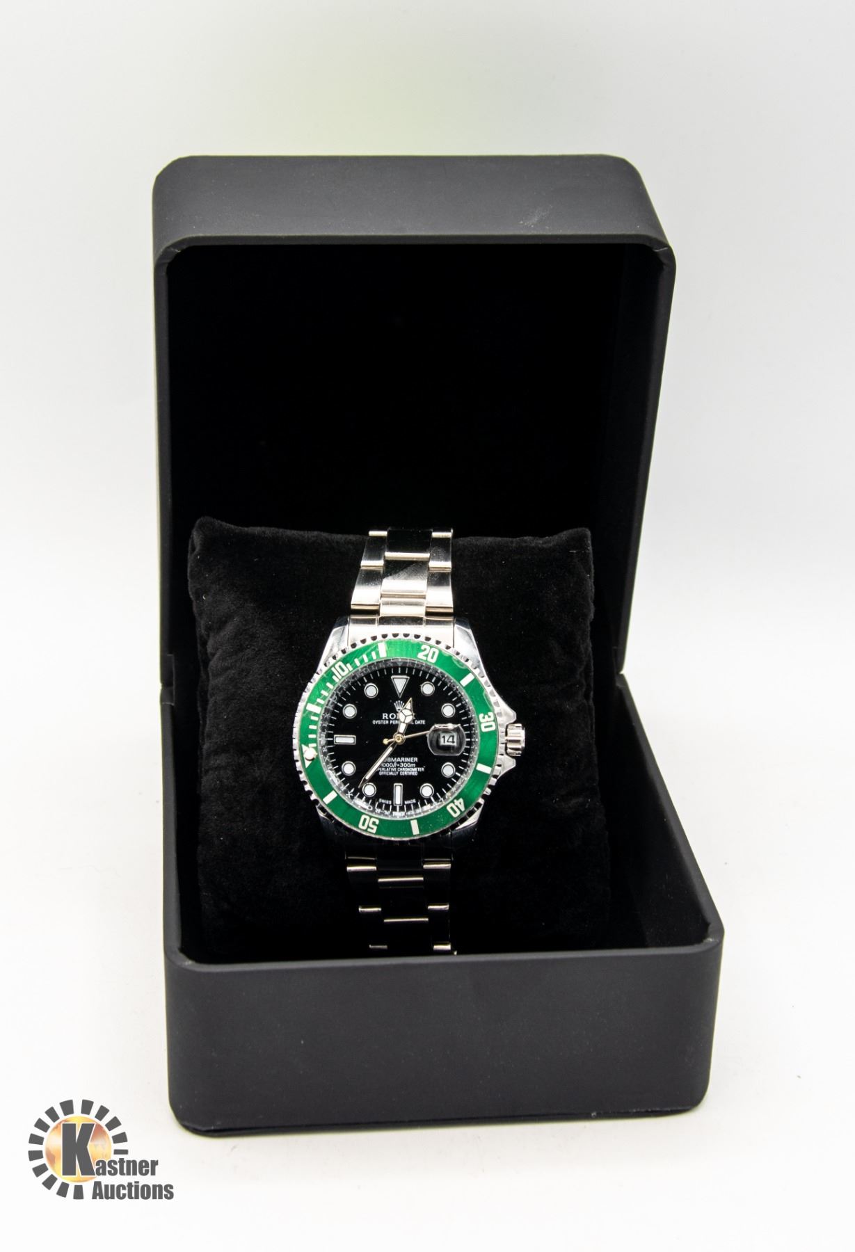 CHRONOMETER STAINLESS STEEL BACK WATER RESISTANT WITH GREEN BEZEL AND FACE WITH STEEL BAND WITH WATCH BOX **ALL ITEMS MUST BE REMOVED BY 5PM SATURDAY, MARCH 23RD 2024. ALL REMAINING ITEMS WILL BE SUBJECT TO A $6.00 PER DAY STORAGE CHARGE. ANY ITEMS REMAINING AFTER MONDAY, APRIL 8TH, 2023 WILL BE CONSIDERED FORFEITED. NO REFUNDS WILL BE ISSUED FOR FORFEITED ITEMS. TO SCHEDULE A PICK UP APPOINTMENT CLICK HERE