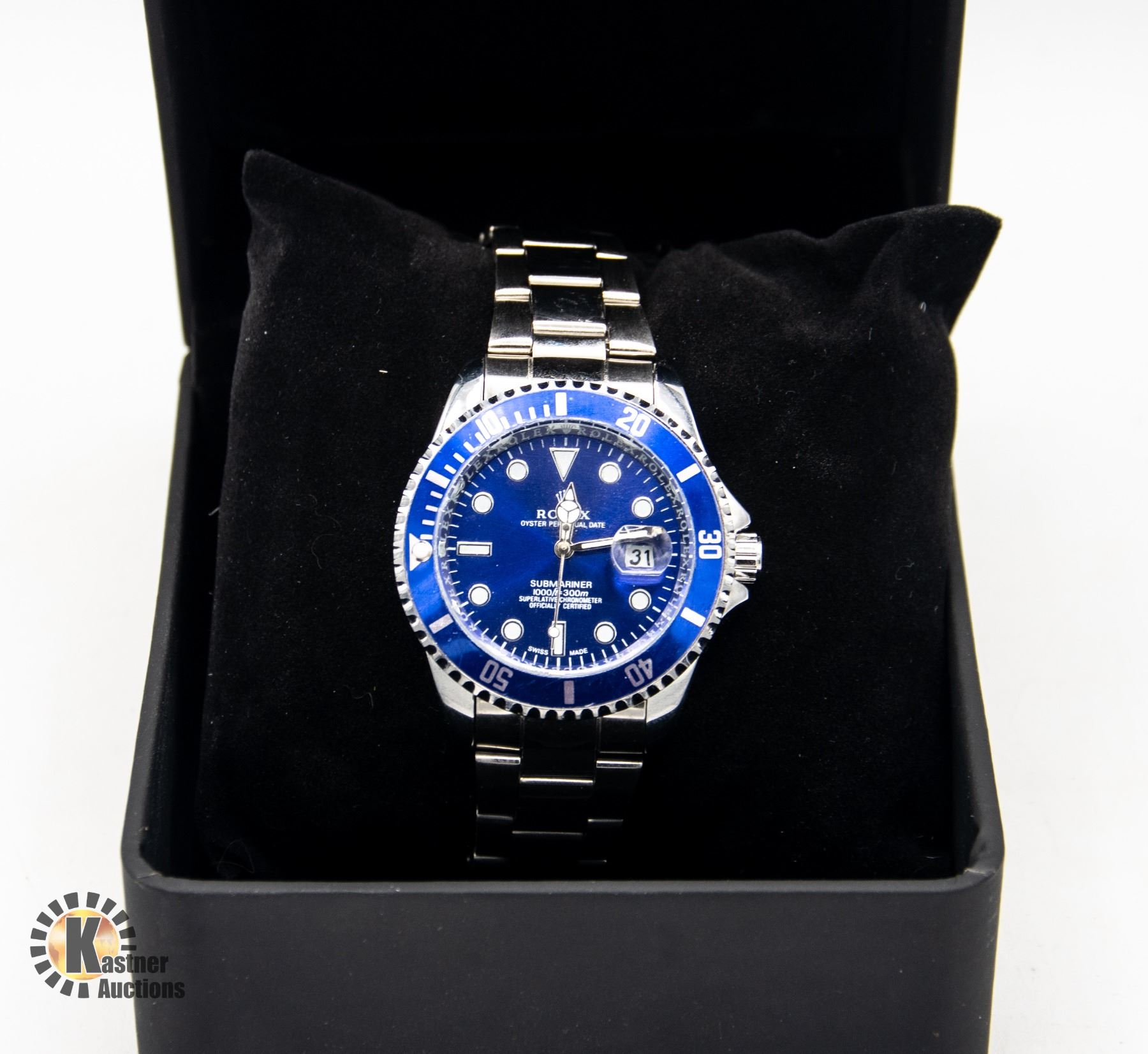 CHRONOMETER STAINLESS STEEL BACK WATER RESISTANT WITH BLUE BEZEL AND FACE WITH STEEL BAND WITH WATCH BOX **ALL ITEMS MUST BE REMOVED BY 5PM SATURDAY, MAY 11THTH 2024. ALL REMAINING ITEMS WILL BE SUBJECT TO A $6.00 PER DAY STORAGE CHARGE. ANY ITEMS REMAINING AFTER MONDAY, MAY 27TH 2024 WILL BE CONSIDERED FORFEITED. NO REFUNDS WILL BE ISSUED FOR FORFEITED ITEMS. TO SCHEDULE A PICK UP APPOINTMENT CLICK HERE