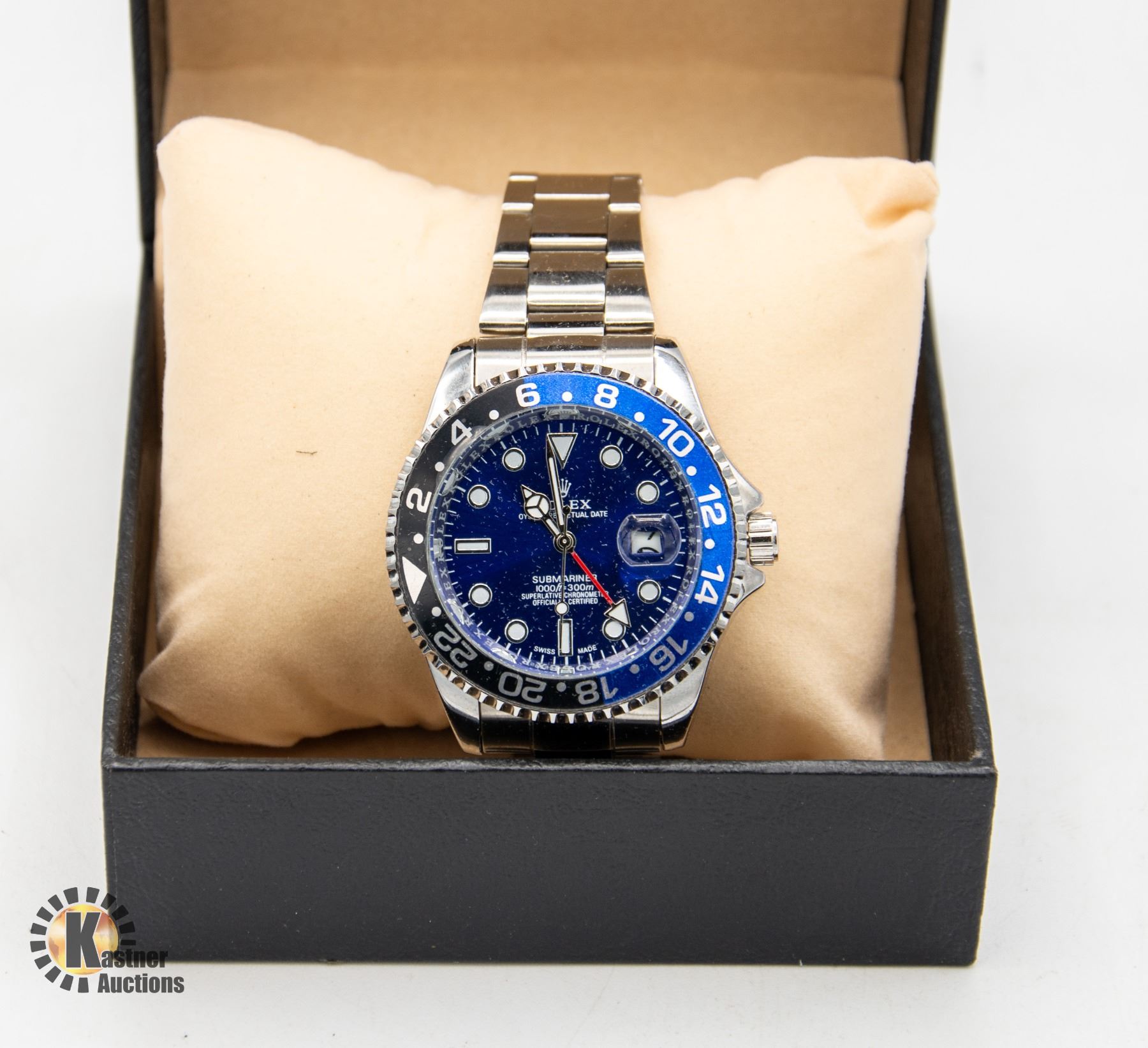 CHRONOMETER STAINLESS STEEL BACK WATER RESISTANT WITH BLUE BEZEL AND FACE STEEL BAND WITH WATCH BOX **ALL ITEMS MUST BE REMOVED BY 5PM SATURDAY, MAY 18THTH 2024. ALL REMAINING ITEMS WILL BE SUBJECT TO A $6.00 PER DAY STORAGE CHARGE. ANY ITEMS REMAINING AFTER MONDAY, JUNE 3RD 2024 WILL BE CONSIDERED FORFEITED. NO REFUNDS WILL BE ISSUED FOR FORFEITED ITEMS. TO SCHEDULE A PICK UP APPOINTMENT CLICK HERE