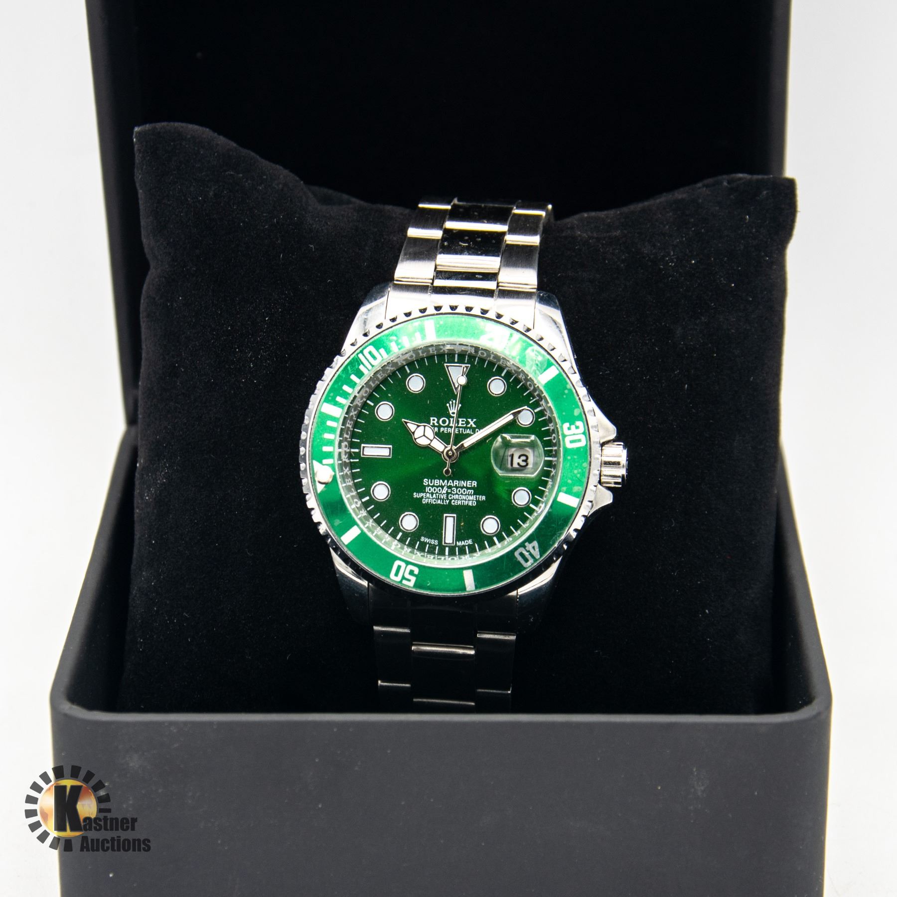 SUPERLATIVE CHRONOMETER STAINLESS BACK WATER RESISTANT WITH GREEN BEZEL AND FACE WITH WATCH BOX **ALL ITEMS MUST BE REMOVED BY 5PM SATURDAY, SEPTEMBER 23RD 2023. ALL REMAINING ITEMS WILL BE SUBJECT TO A $6.00 PER DAY STORAGE CHARGE. ANY ITEMS REMAINING AFTER MONDAY, OCTOBER 9TH, 2023 WILL BE CONSIDERED FORFEITED. NO REFUNDS WILL BE ISSUED FOR FORFEITED ITEMS. TO SCHEDULE A PICK UP APPOINTMENT CLICK HERE