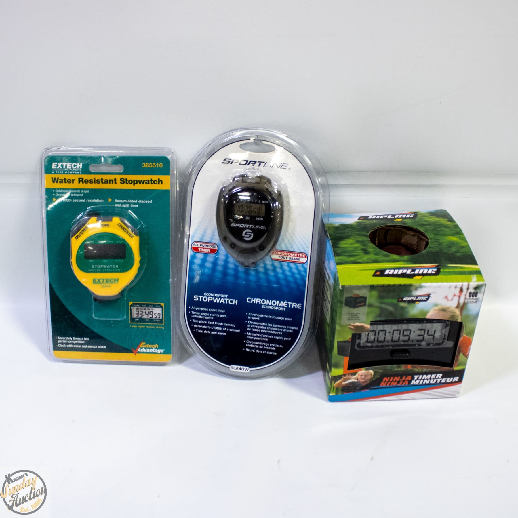 W/NEW EXTECH WATER RESISTANT STOPWATCH W/NEW SPORTLINE ALL PURPOSE TIMER STOPWATCH **ALL ITEMS MUST BE REMOVED BY 5PM SATURDAY, APRIL 18TH 2026. ALL REMAINING ITEMS WILL BE SUBJECT TO A $6.00 PER DAY STORAGE CHARGE. ANY ITEMS REMAINING AFTER MONDAY, MAY 4TH 2026 WILL BE CONSIDERED FORFEITED. NO REFUNDS WILL BE ISSUED FOR FORFEITED ITEMS. TO SCHEDULE A PICK UP APPOINTMENT CLICK HERE