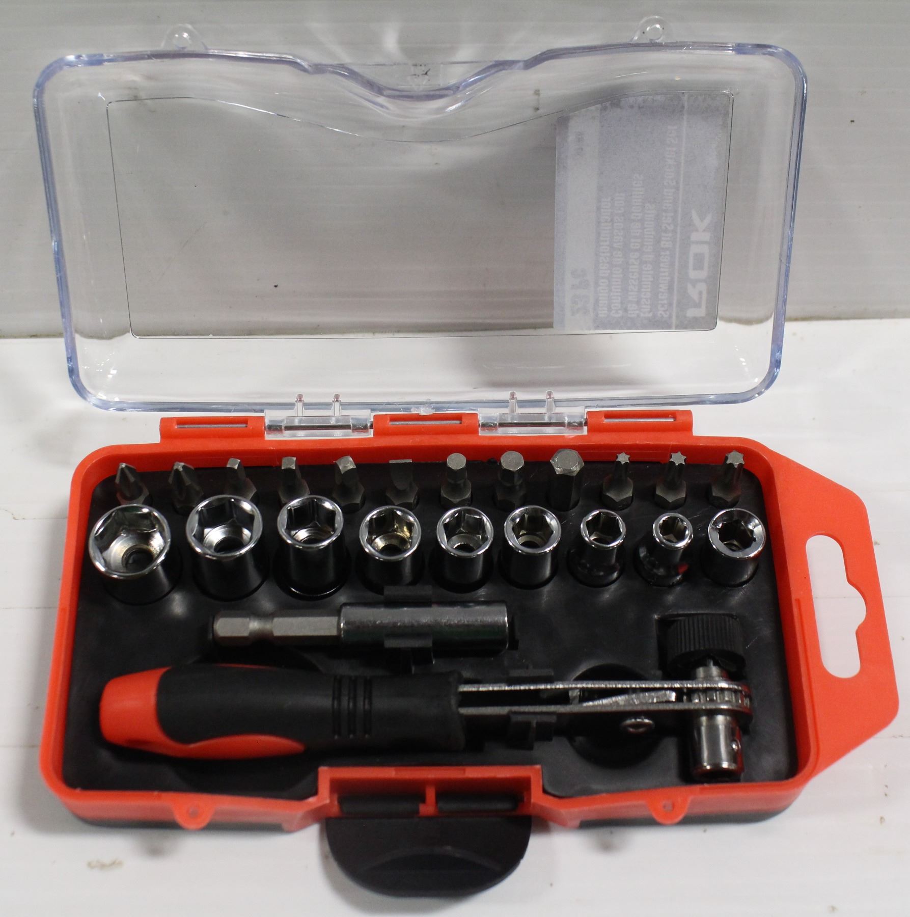 IN CASE W/ RUBBER NON-SLIP BOTTOM. INCLUDES: RATCHET DRIVER, 2" EXTENSION BAR, COUPLER, 12 DRIVER BITS, 8 SOCKETS - 1/4" DRIVE **ALL ITEMS MUST BE REMOVED BY 5PM SATURDAY, FEBRUARY 4TH 2023.** ALL REMAINING ITEMS WILL BE SUBJECT TO A $6.00 PER DAY STORAGE CHARGE. ANY ITEMS REMAINING AFTER MONDAY, FEBRUARY 20TH, 2023 WILL BE CONSIDERED FORFEITED. NO REFUNDS WILL BE ISSUED FOR FORFEITED ITEMS. TO SCHEDULE A PICK UP APPOINTMENT CLICK HERE