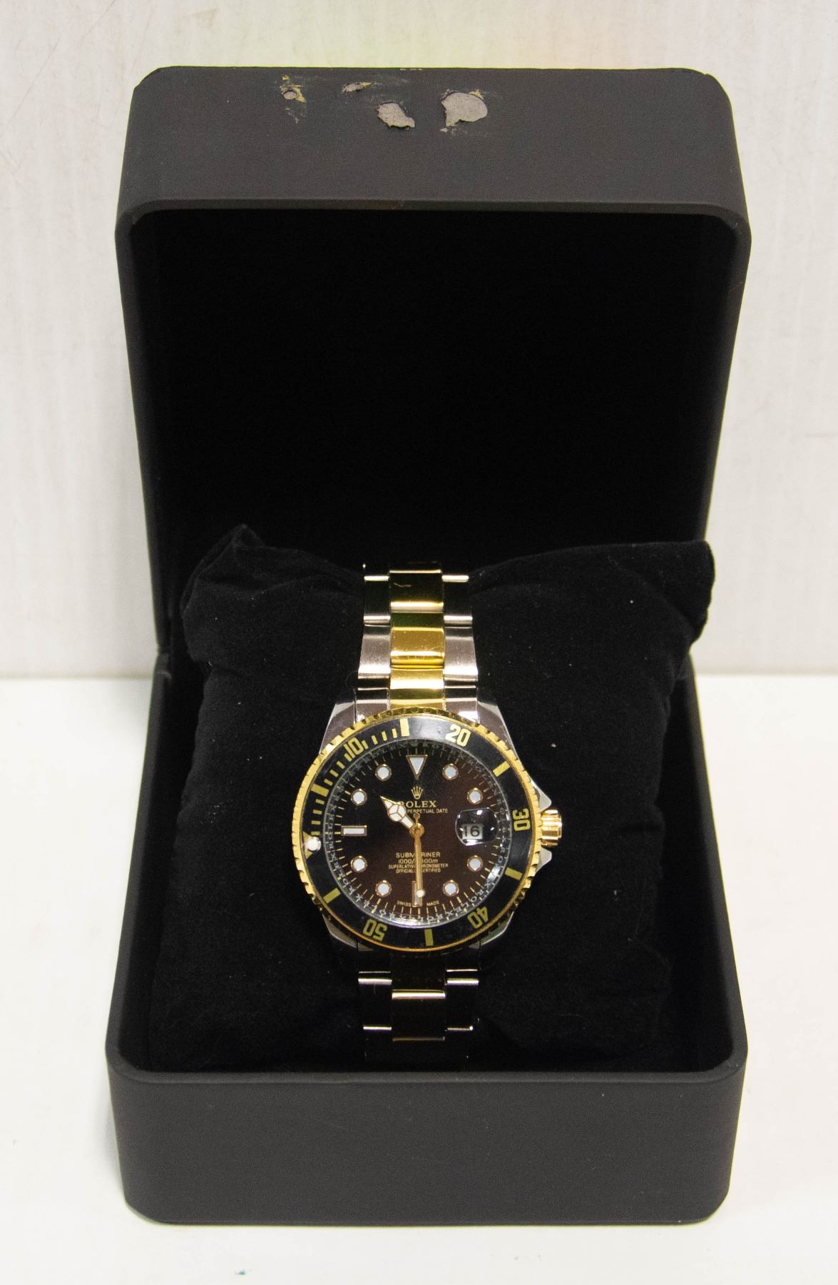 CHRONOMETER STAINLESS STEEL BACK WATER RESISTANT WITH BLACK AND GOLD BEZEL AND BLACK FACE WITH STEEL BAND AND WATCH BOX