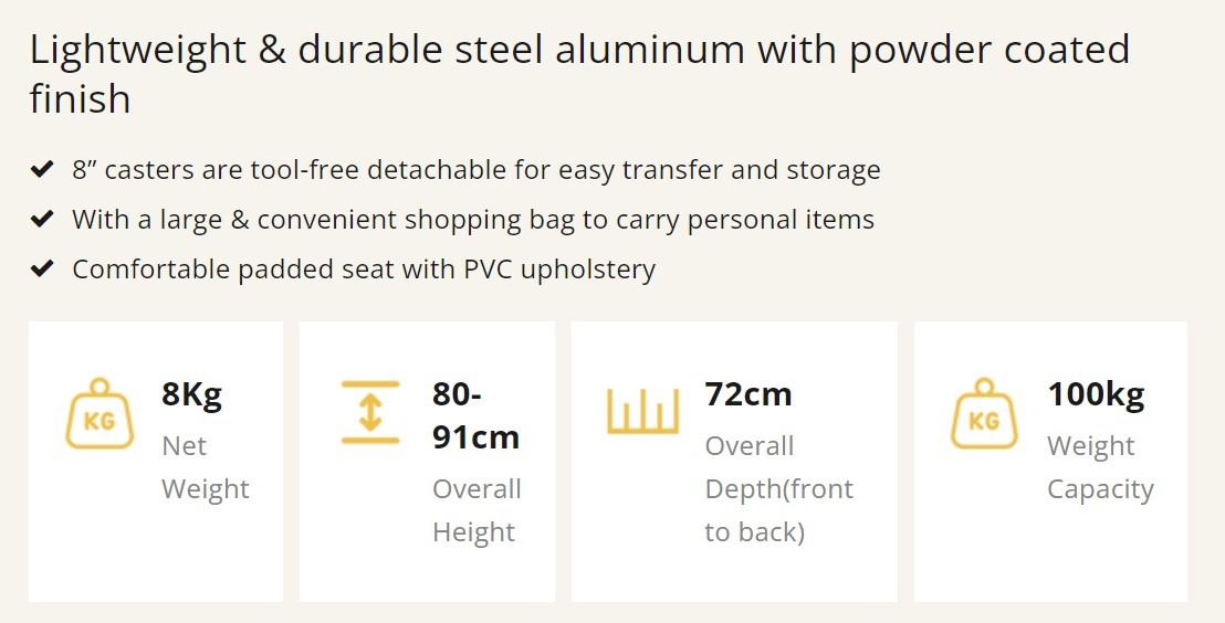 8" CASTERS ARE TOOL-FREE DETACHABLE FOR EASY TRANSFER AND STORAGE,WITH A LARGE & CONVENIENT SHOPPING BAG TO CARRY PERSONAL ITEMS,COMFORTABLE PADDED SEAT WITH PVC UPHOLSTERY