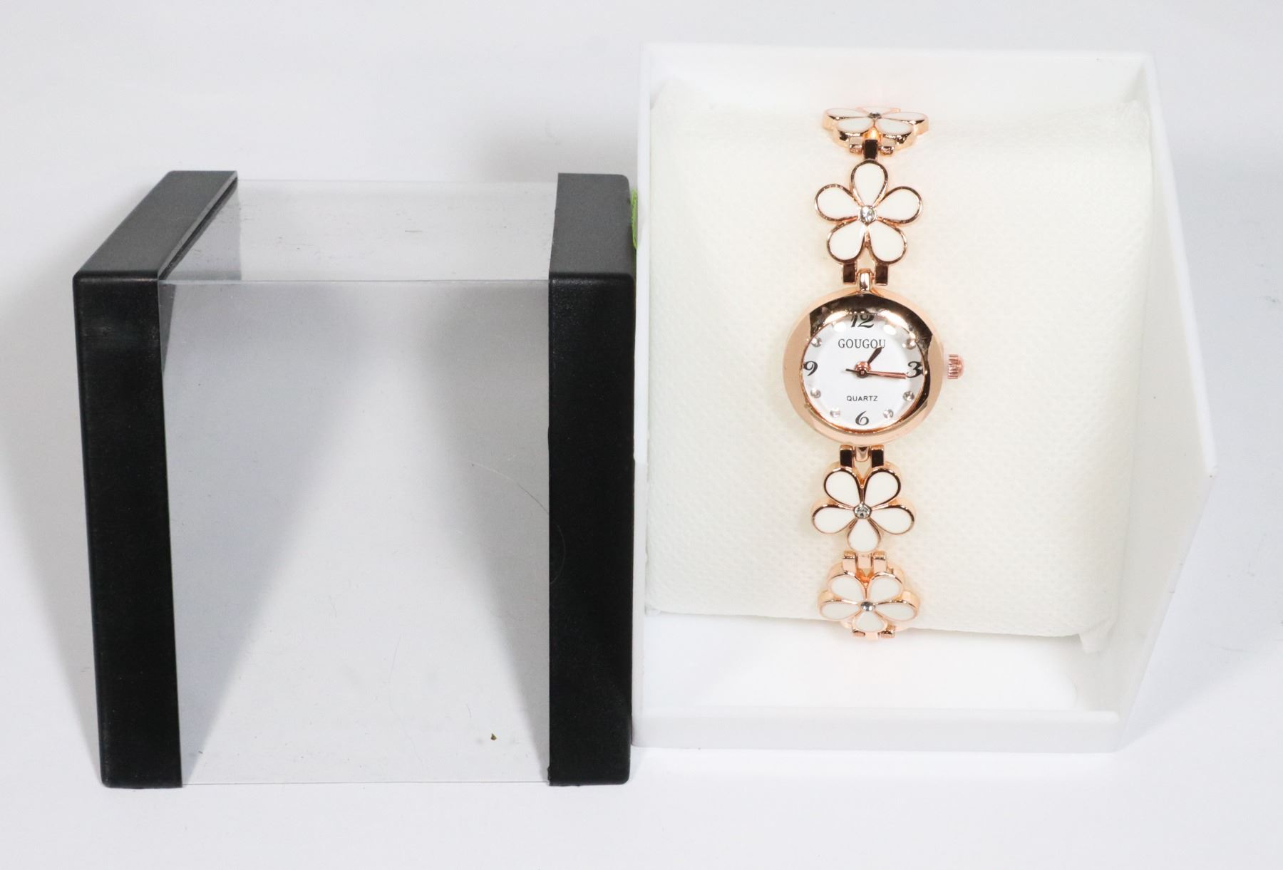 HAS RHINESTONE ACCENTS FOR NUMBERS AND IN THE CENTER OF THE FLOWERS