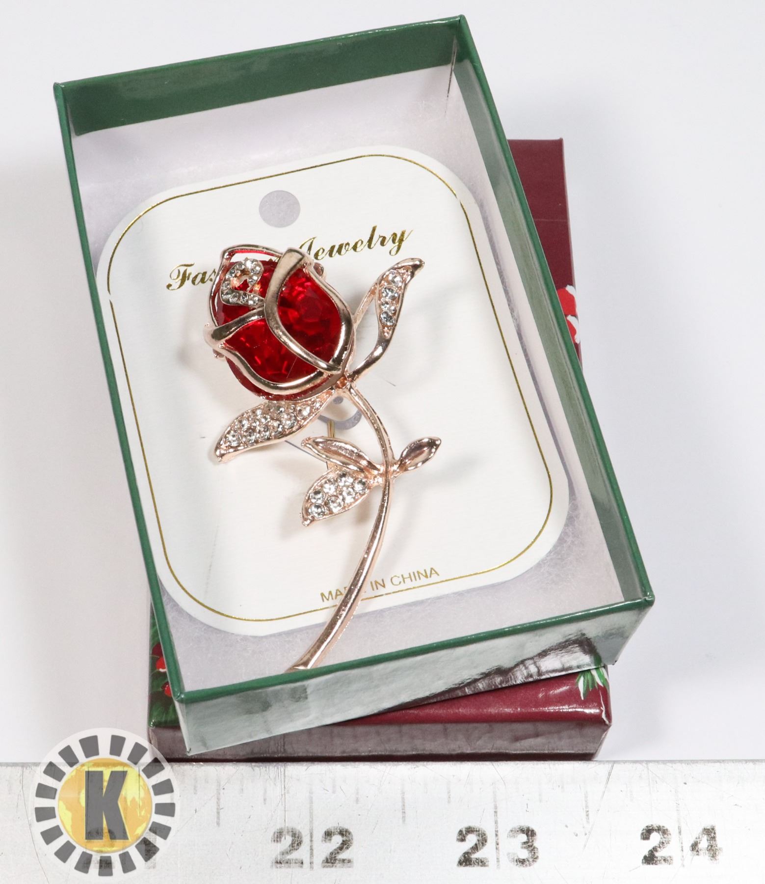 NEW ROSE GOLD TONE ROSE BROOCH WITH RHINESTONES
