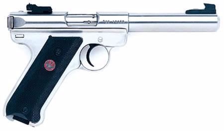Mfr Items:Ruger Category:PISTOLS Action:Single Caliber:22 Long Rifle Barrel Length:5.5" Capacity:10+1 Safety:Manual Grips:Black Synthetic Sights:Fixed Front, Adjustable Rear Weight:42 oz Frame Finish:Stainless Frame Material:Stainless Steel Barrel Type:Bull Slide Description:Stainless Steel Case Type:Hard