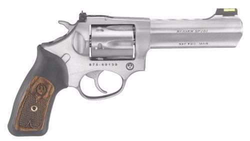 FAMILY:SP101 Series MODEL:SP101 TYPE:Revolver ACTION:Double / Single Action FINISH:Satin Stainless STOCK/FRAME:Steel Frame STOCK/GRIPS:Black Rubber w/Engraved Wood CALIBER/GAUGE:327 Federal Magnum CAPACITY:6 BARREL:4.20" OVERALL LENGTH:9.12" RATE-OF-TWIST:1-in-16" SIGHTS:FS: Fiber Optic/RS: Adjustable SAFETY:Transfer Bar GUN CASE:Plastic